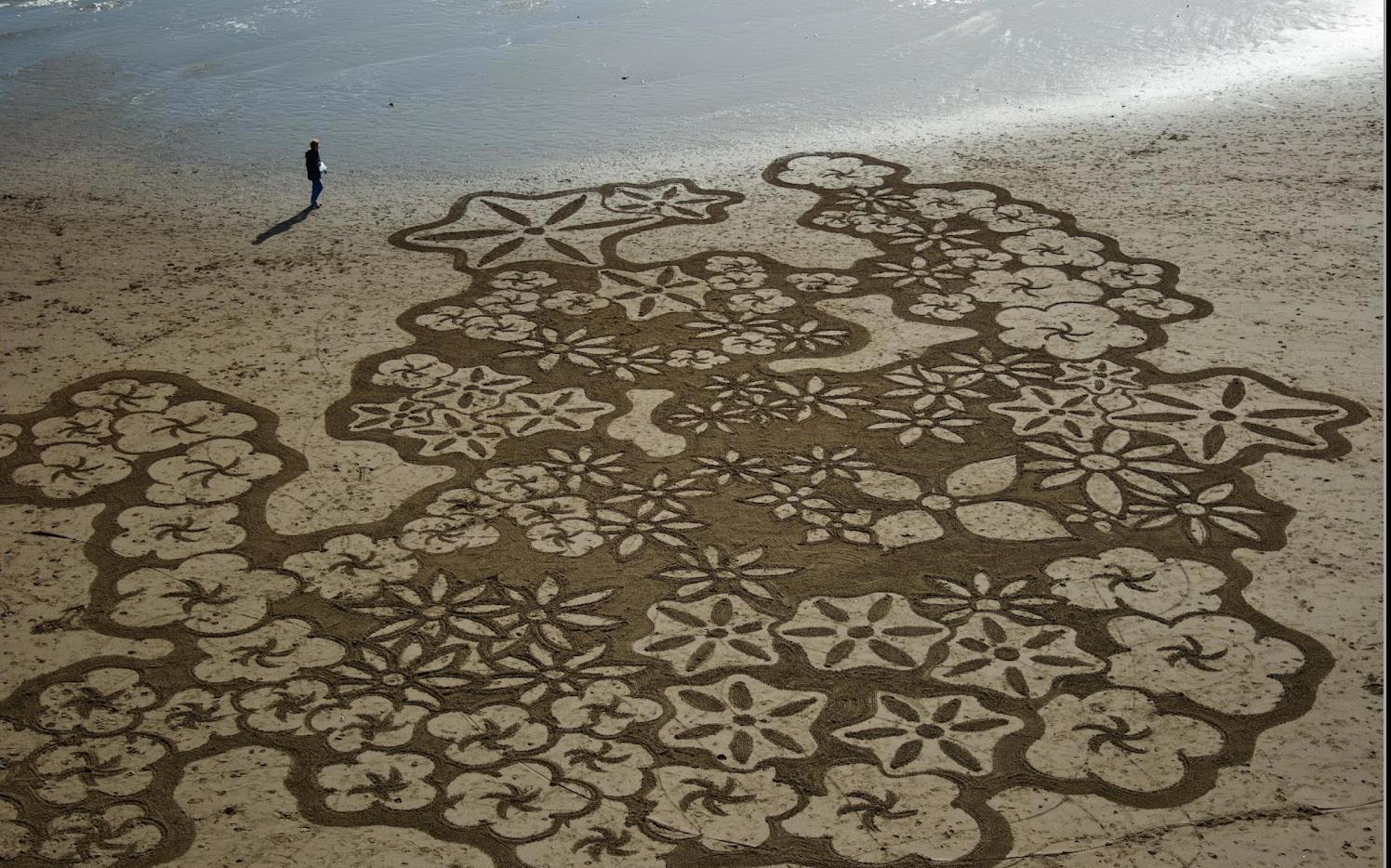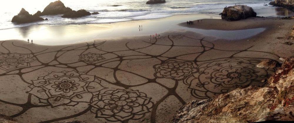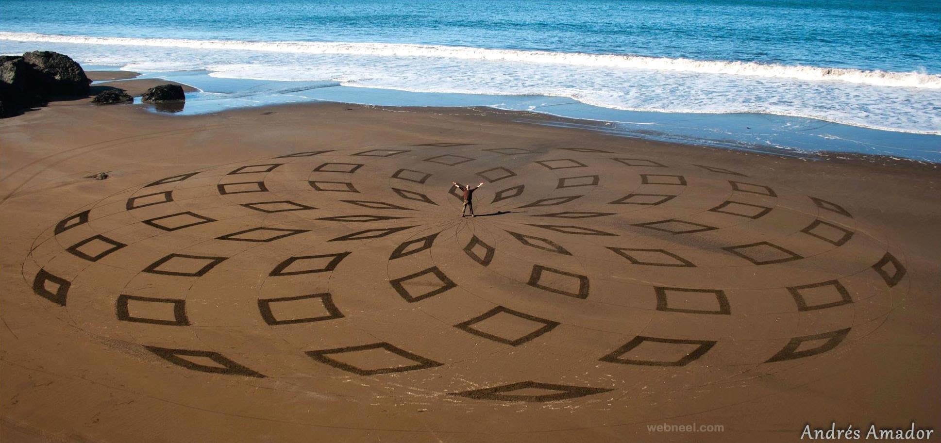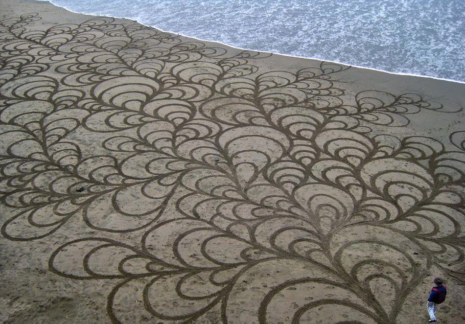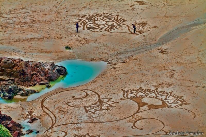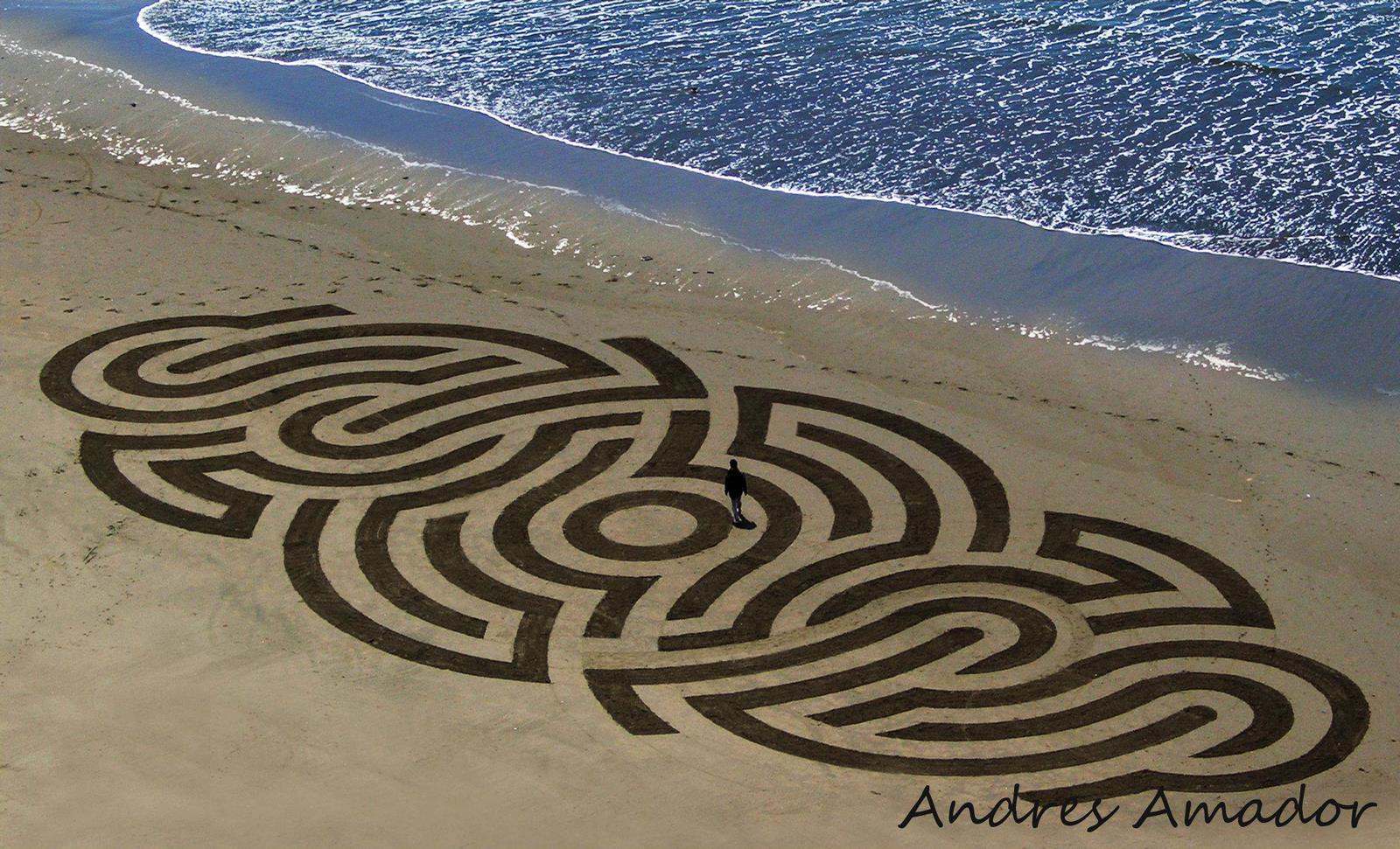 С 2004 года художник-пейзажист из Сан-Франциско Андрес Амадор печатает на песке свои крупномасштабные органические рисунки, вдохновленные фракталами. вооруженный всего лишь граблями, художник вытравливает свои массивные иллюстрации на песке в полнолуние, когда его холст достигает наибольшего потенциала, когда прилив усиливается, масштабные, замысловатые картины из песка исчезают вскоре после того, как они созданы, как своего рода современная, живая песчаная мандала.