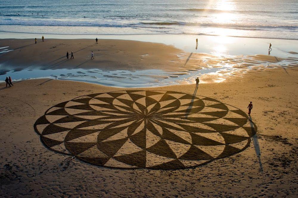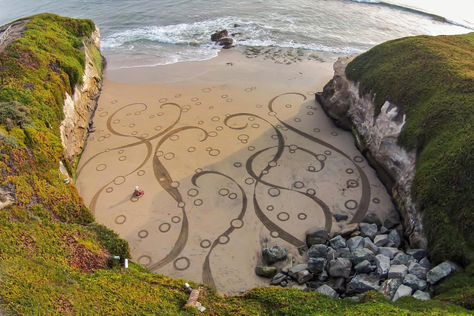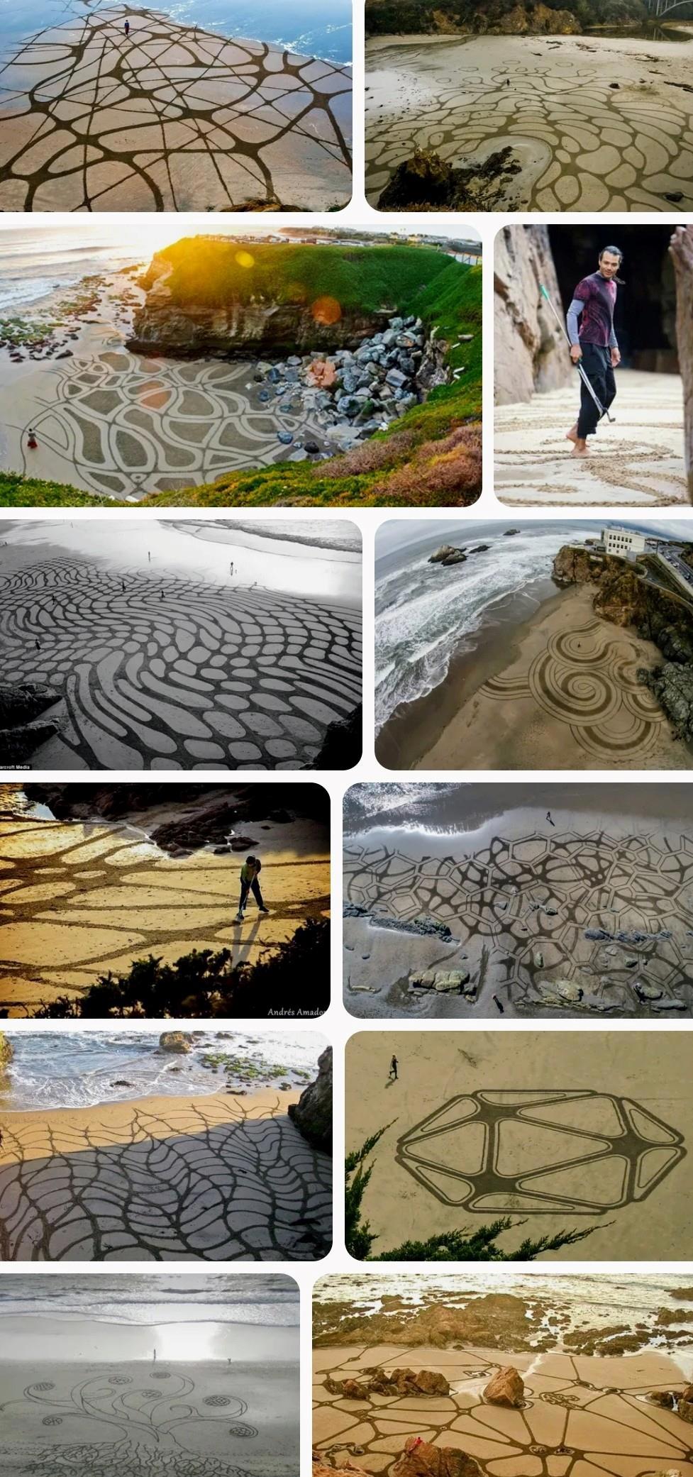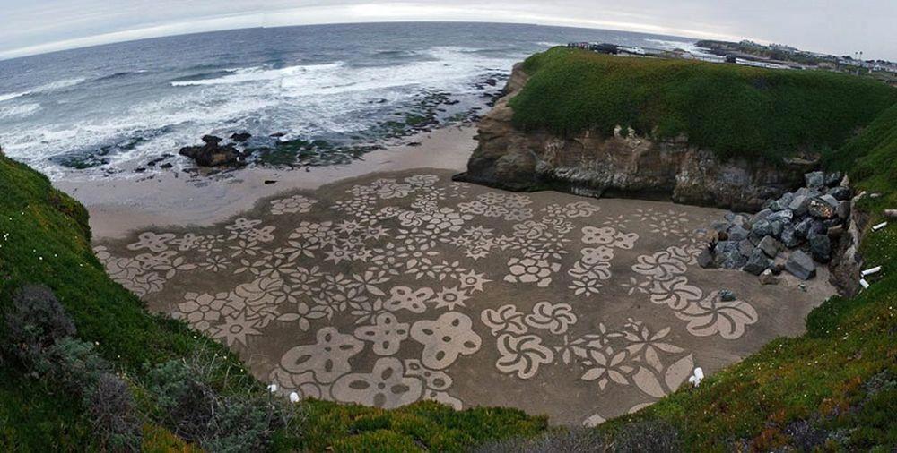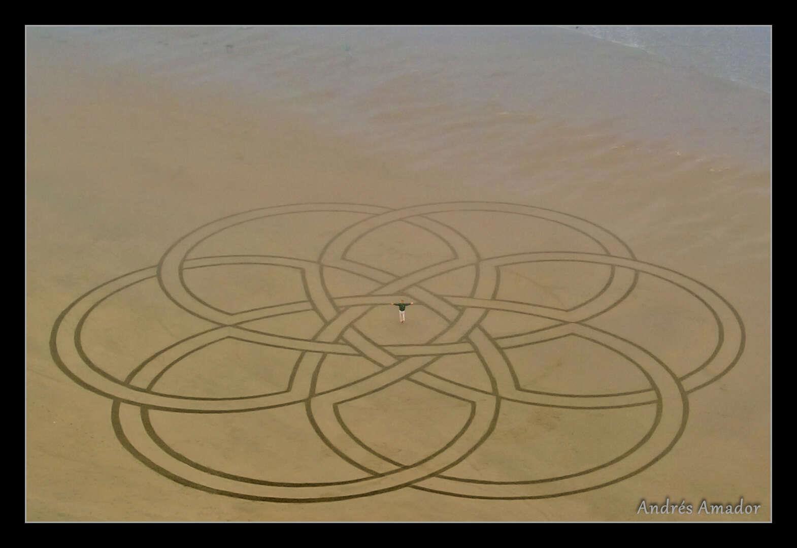 С 2004 года художник-пейзажист из Сан-Франциско Андрес Амадор печатает на песке свои крупномасштабные органические рисунки, вдохновленные фракталами. вооруженный всего лишь граблями, художник вытравливает свои массивные иллюстрации на песке в полнолуние, когда его холст достигает наибольшего потенциала, когда прилив усиливается, масштабные, замысловатые картины из песка исчезают вскоре после того, как они созданы, как своего рода современная, живая песчаная мандала.
