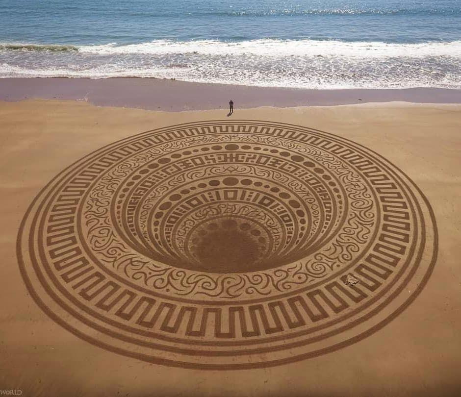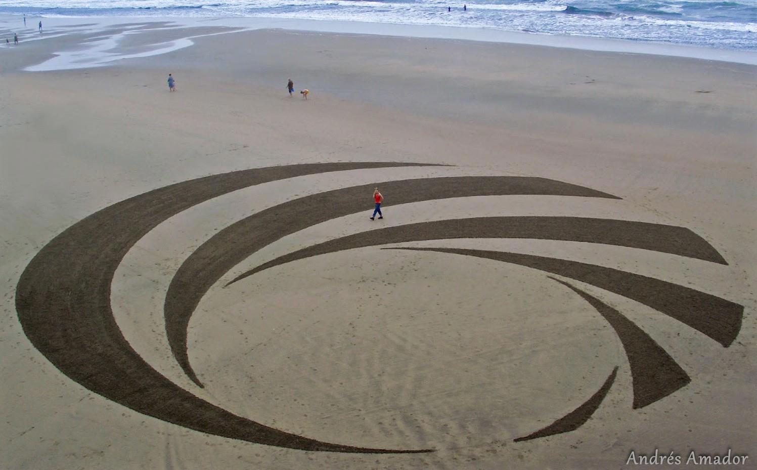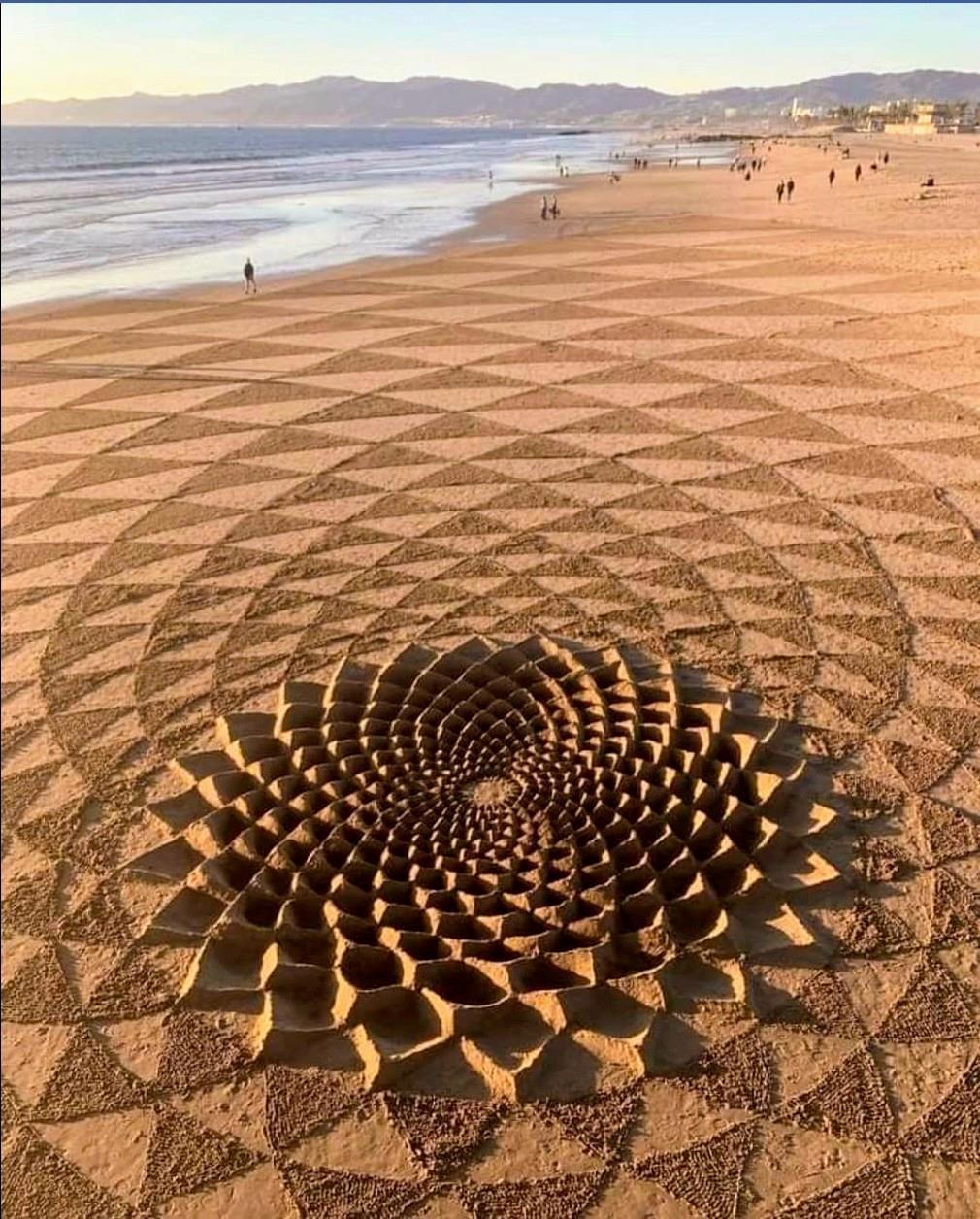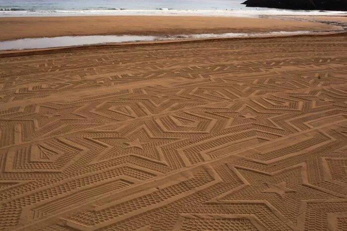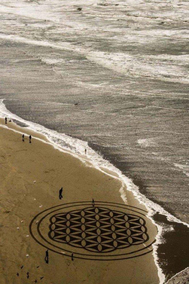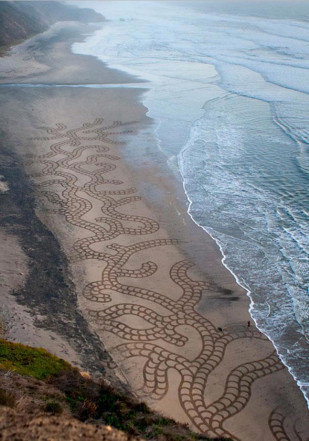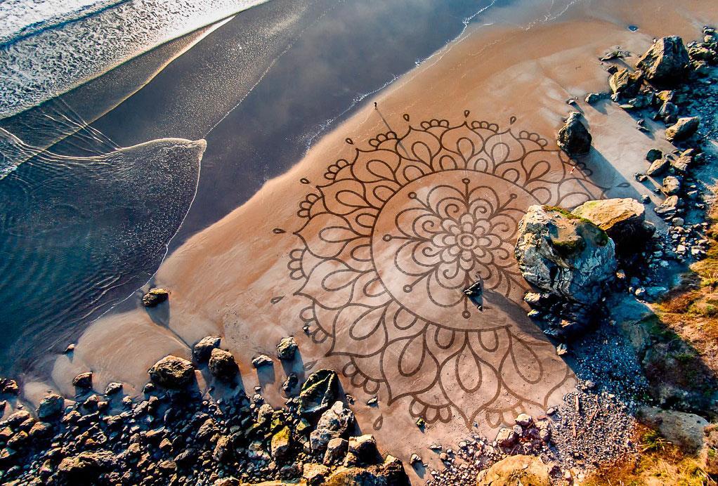 С 2004 года художник-пейзажист из Сан-Франциско Андрес Амадор печатает на песке свои крупномасштабные органические рисунки, вдохновленные фракталами. вооруженный всего лишь граблями, художник вытравливает свои массивные иллюстрации на песке в полнолуние, когда его холст достигает наибольшего потенциала, когда прилив усиливается, масштабные, замысловатые картины из песка исчезают вскоре после того, как они созданы, как своего рода современная, живая песчаная мандала.