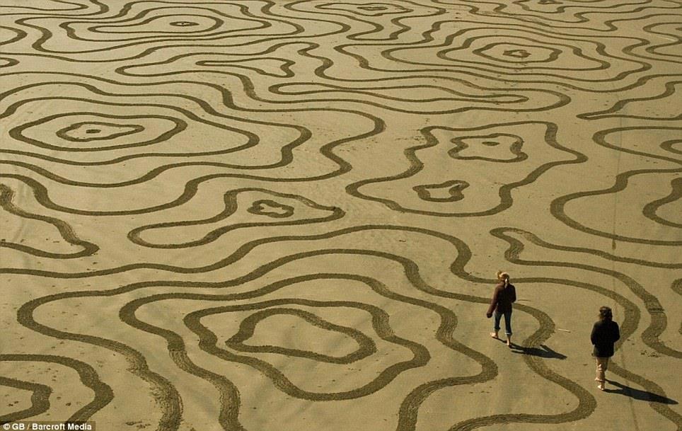 Взяв за основу обычный фигурный валик для декоративных работ, увеличенный до размеров вальца дорожного катка, установленного на трактор, используемый для очистки пляжа, она получила весьма эффективное средство артификации территории.