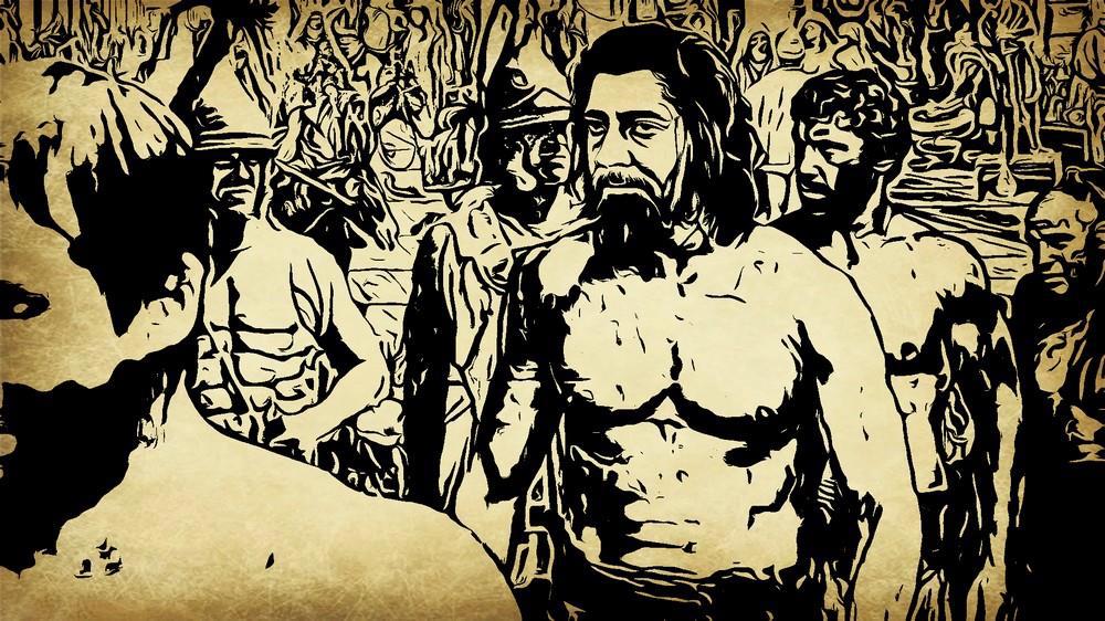 Взгляд Антенора задержался на одном из рабов. То был очень смуглый человек, худой и всклокоченный. Всей одежды на нём — серая холстина на бёдрах, повязанная необычным для здешних мест способом. Длинные спутанные волосы и борода, по всему видать, давно уже не знали гребня. Всё тело покрыто шрамами.