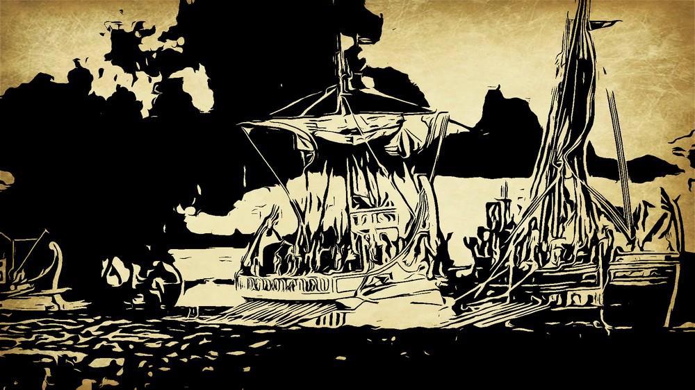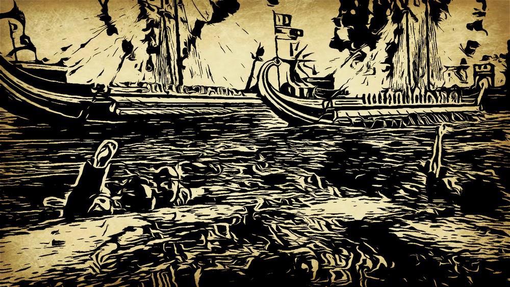 Ближе к берегу одолевали «египтяне». Это уже очевидно. Из воды торчали несколько кормовых завитков, оканчивавшихся красной розой, символом Родоса. Волны кишели людьми и несколько египетских кораблей продвигались вперёд прямо по головам несчастных моряков. Они тянули руки к своим врагам, умоляя о помощи, слали проклятья, пытались уцепиться за борта.