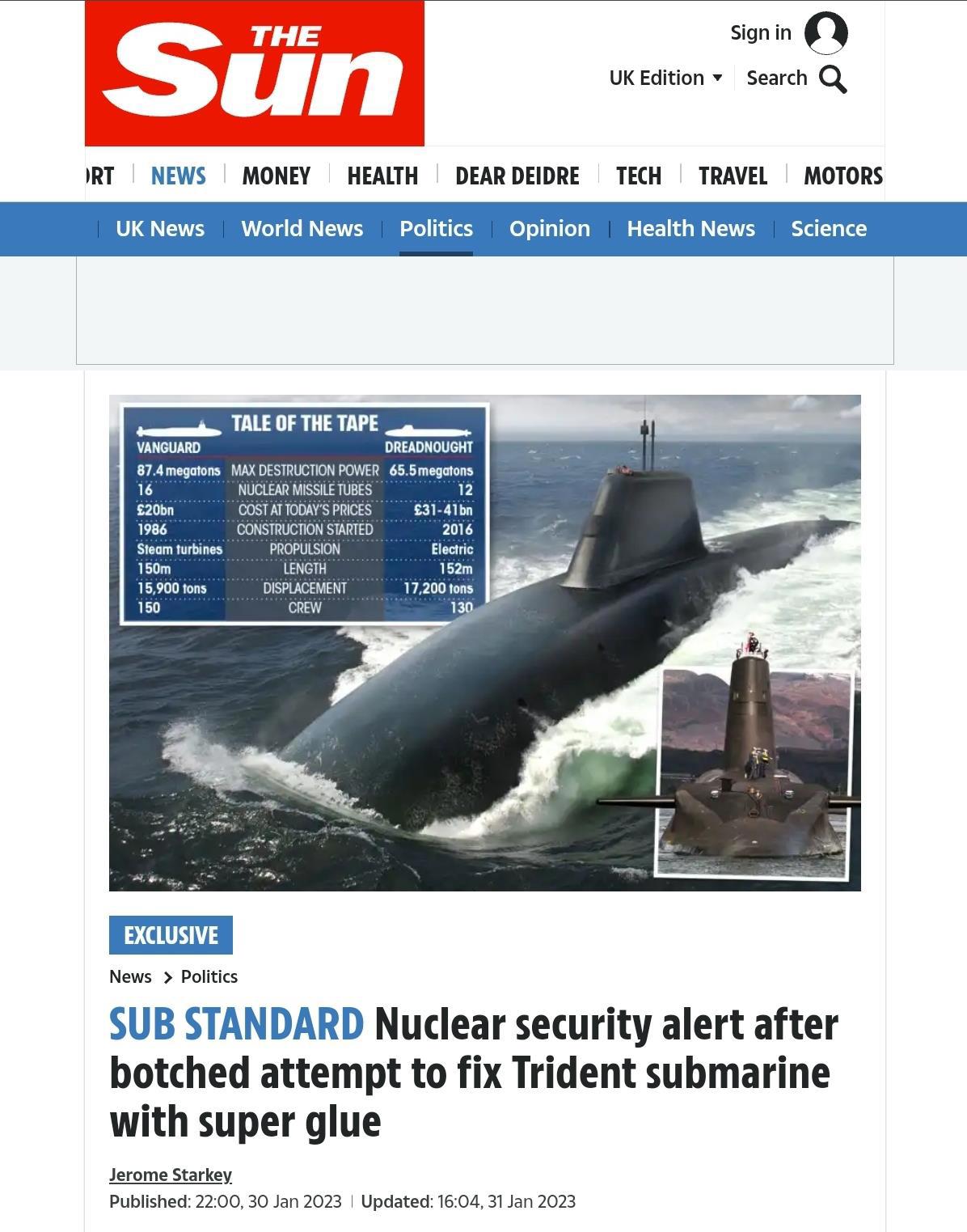Позачера газета "The Sun " вышла со статьей (https://www.thesun.co.uk/news/21217944/nuclear-security-alert-botched-repair-trident-submarine-super-glue/) , в которой приводятся интересные факты, касающиеся этого ремонта.