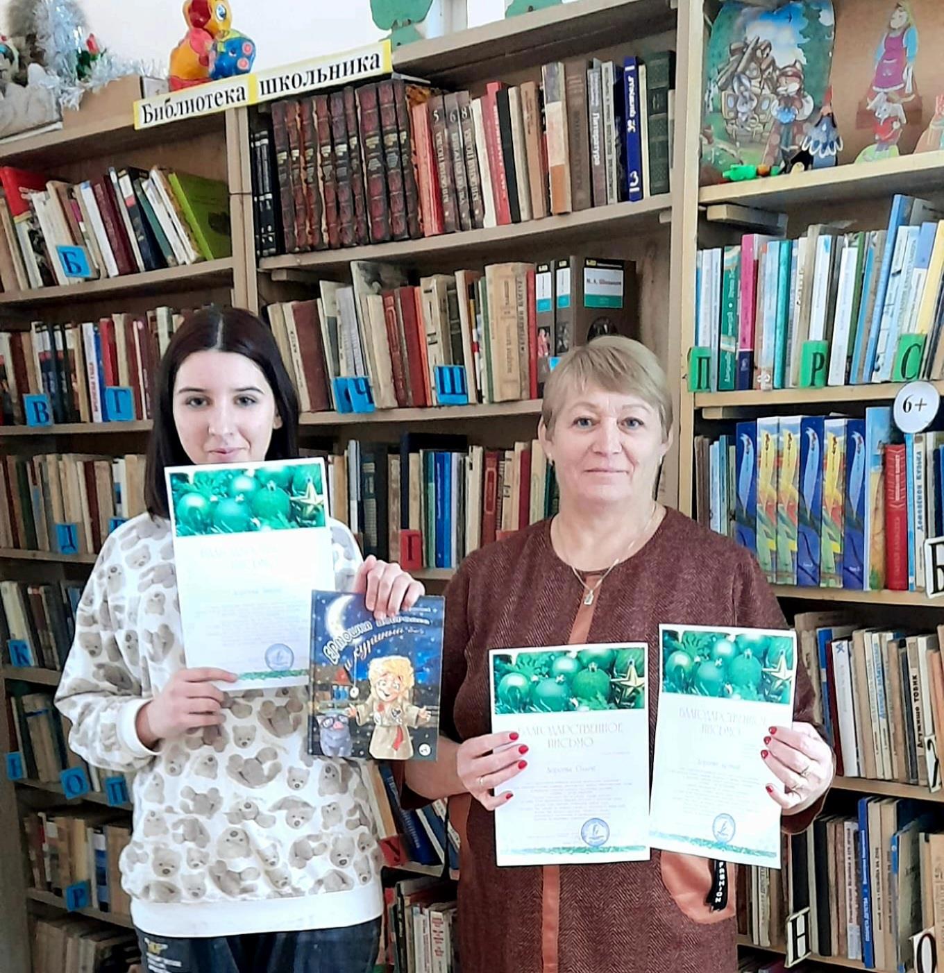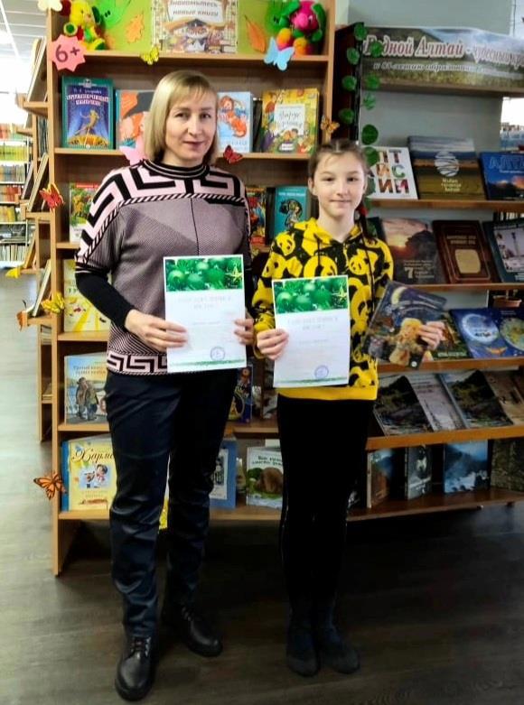 На фото рядом с библиотекарем юная читательница - четырнадцатилетняя Диана Рыбакова из пос. Октябрьский Змеиногорского района с Благодарственным письмом и книгой с автографом автора...