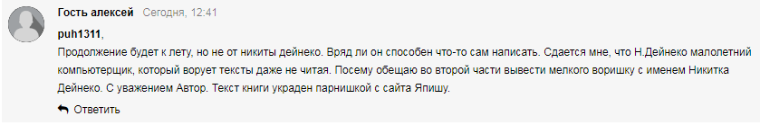 Только вот наш персонаж забыл подумать о том, что некоторые сайты копируют текст. Выложенная книга доступна уже на десятках сайтах. Можете написать в поисковике "Никита Дейнеко Попал" и вам выйдет все выйдет