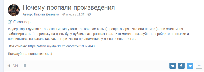 Одна его книга была в виджетах. Я точно сама видела. Внезапно его книги пропали. Тут он решил написать, что администрация ДУМАЕТ, что он все сплагиатил, поэтому удалила все книги.