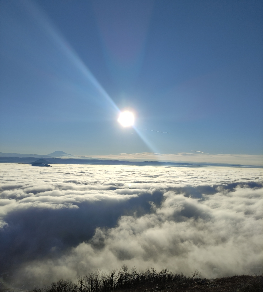 Чудесный город был затянут облаками, но стоило подняться на Машук (993 м), причем, на джипе - фуникулёр не работал, как мы почувствовали себя на вершине мира: перед нами Бештау, пятиглавая горная гряда, давшая название городу, вдали двуглавый Эльбрус, над нами голубое небо и яркое солнце, а внизу безбрежный океан из медленно плывущих белых облаков.
