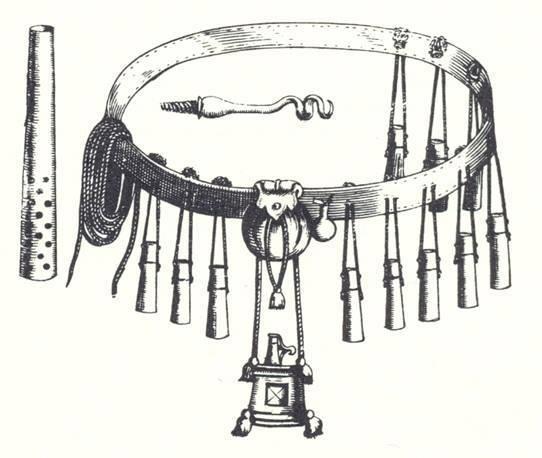 Порох для заряжания с конца 16 века стрелки носили отмеряными на один выстрел в небольших деревянных пенальчиках с деревянными пробками, подвешенных к черезплечевой перевязи. Они хорошо сберегали порох от сырости, но их было всего 12 штук на перевязи. Правда на перевязи была ещё и пороховница с запасом пороха и сумочка с пулями.