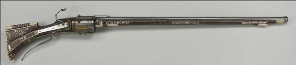Мушкет, 1600-1610 год, Германия. длина общая 1390 мм, длина ствола 944 мм, калибр 18,3 мм. Барабан на 8 зарядов, причем замок фитильный! Оружие из собрания Государственного Эрмитажа, инвентарный номер З.О.-6305.