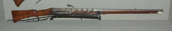 Восьмизарядная аркебуза. Германия. 1600-1620 гг. Заряжается по принципу "бутерброда". Первый выстрел самый крайний к срезу ствола. Подобная аркебуза описана в романе Алексея Зубкова "Плохая война". Отличный роман, рекомендую.
