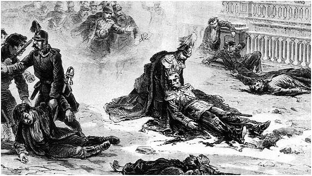 — Ваше императорское величество, умоляю вас, садитесь в сани, едем во дворец… Но, Император отказался, он подошел к покушавшемуся на него Рысакову, затем пошел к месту взрыва. Полковник Дворжицкий шел впереди, с правой стороны Государя находился казак Мачнев, с левой — ротмистр Кулебякин. Постояв немного у ямы, он направился обратно к экипажу и в это время раздался второй страшный взрыв. Когда дым расселся, все увидели окровавленного Императора.