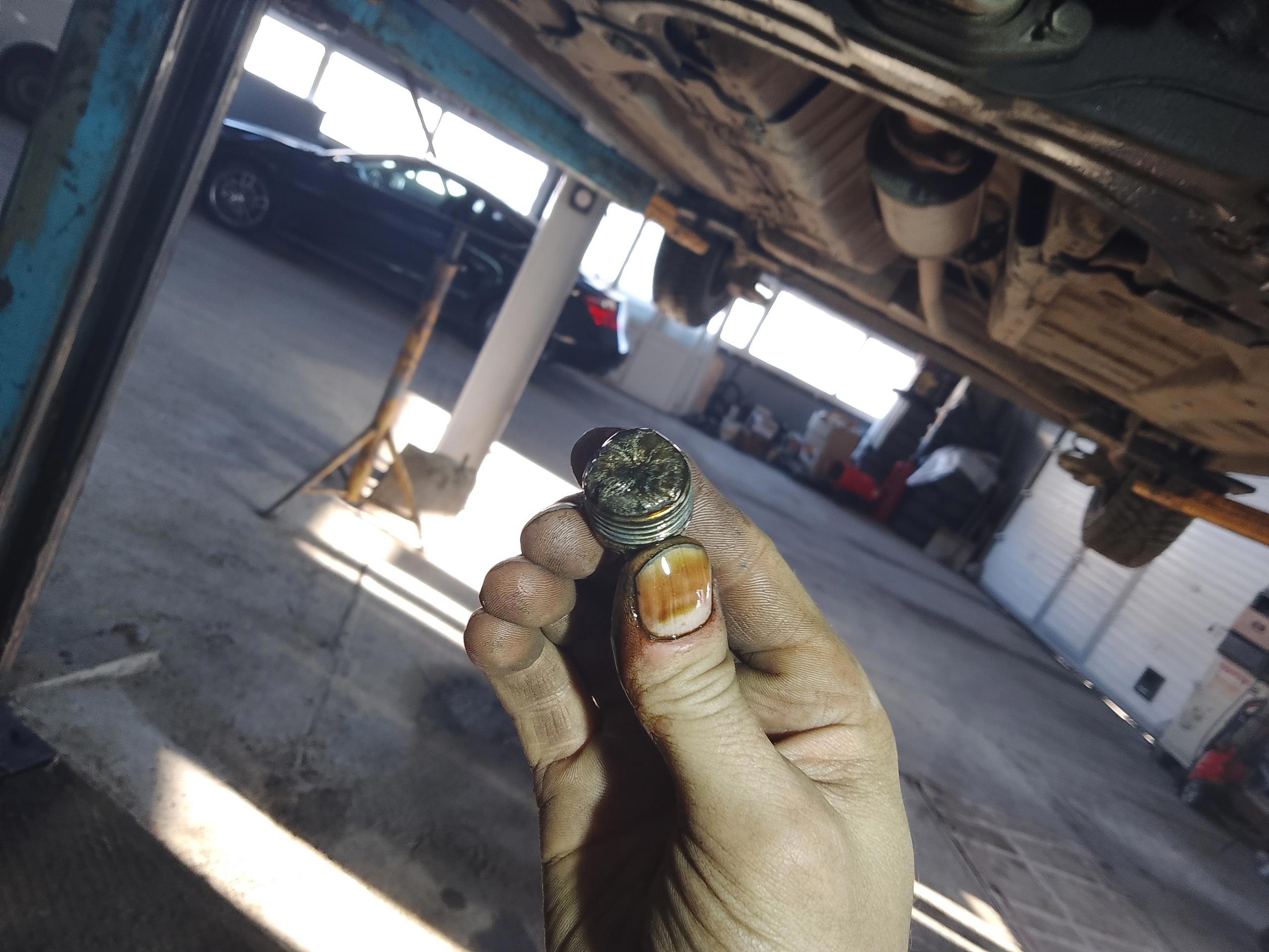 Масла из коробки слилось чуть больше литра, а должно быть 2.8. Кстати, знаете сколько стоит МКПП на это ведро? Даю вам время сделать предположения. =)) На пробке - следы износа.