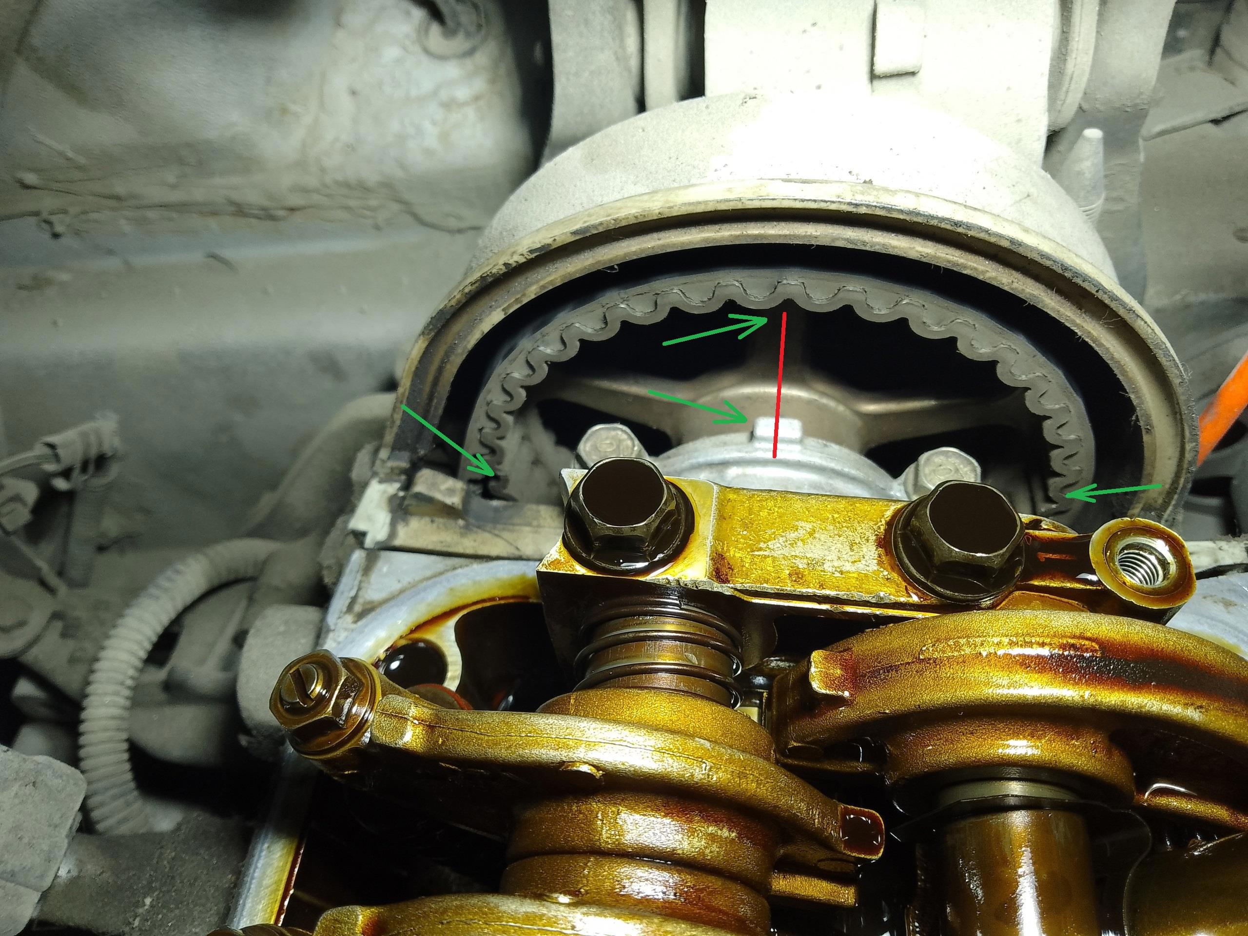 Горизонтальные черточки на шестерне совмещаем с плоскостью разъёма головки и крышки, одна из спиц смотрит вверх - это верхняя мертвая точка первого цилиндра. Если спицы нет - крутим колено на 360 градусов.
