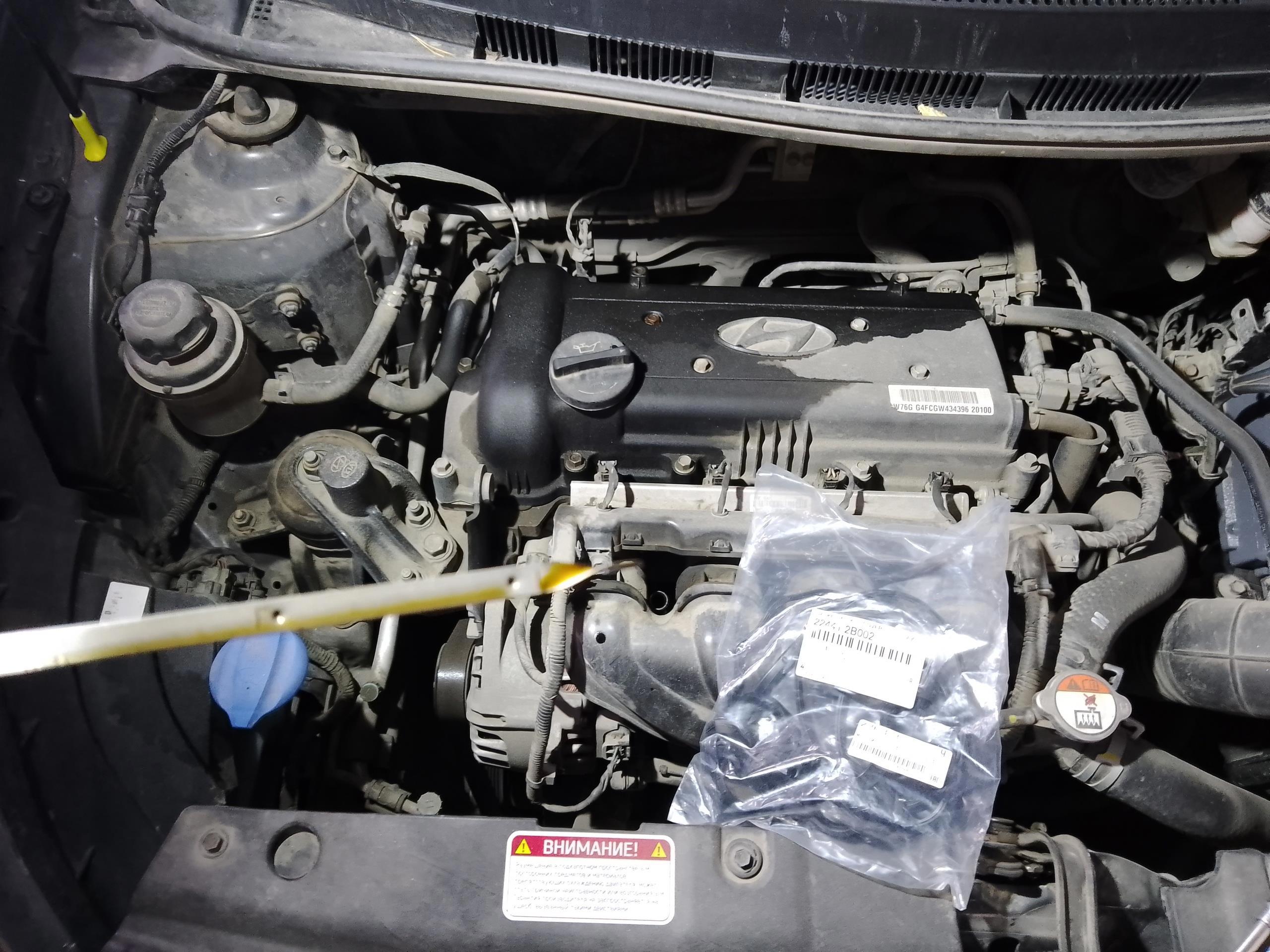 Что же приехало ко мне? А ко мне приехал Солярис, с пробегом в 28 000 километров. Владелец хотел поменять прокладку под клапанной крышкой. Говорит, масло из двигателя пропадает со страшной скоростью. Наверное из-за прокладки. Я, осмотрев машину, сделал вывод что это не имеет ничего общего с действительностью. Но масла в моторе нет - это железобетонный факт.