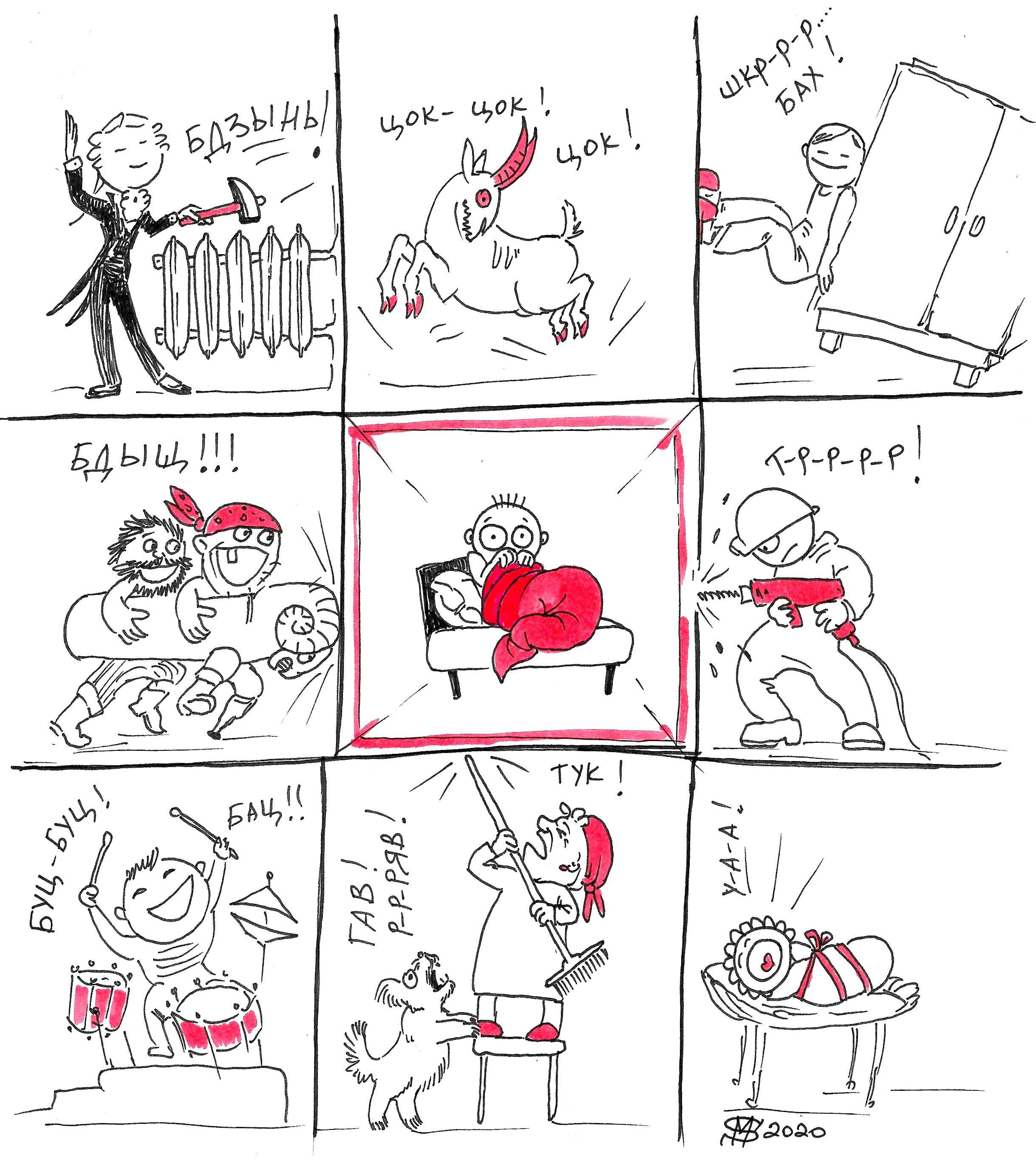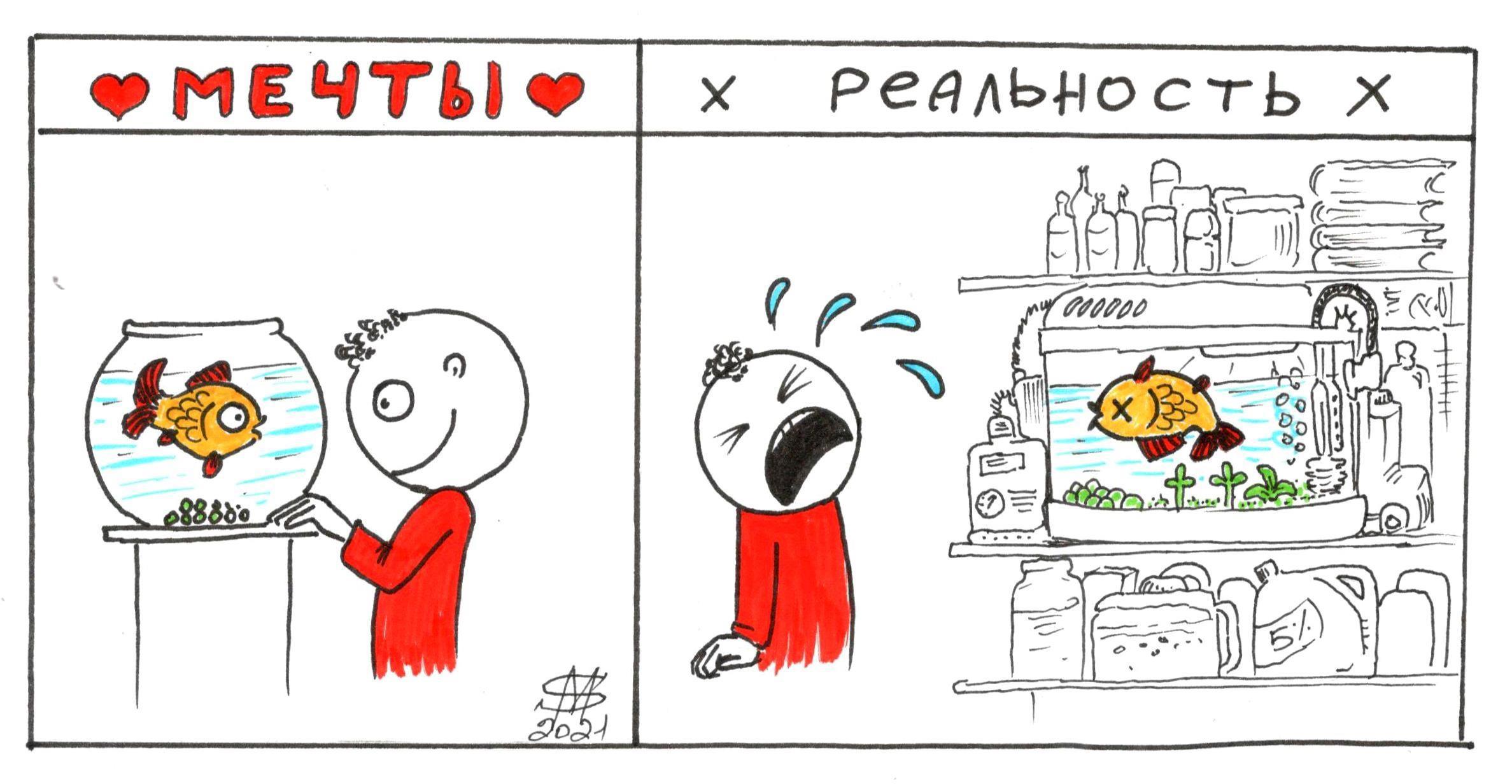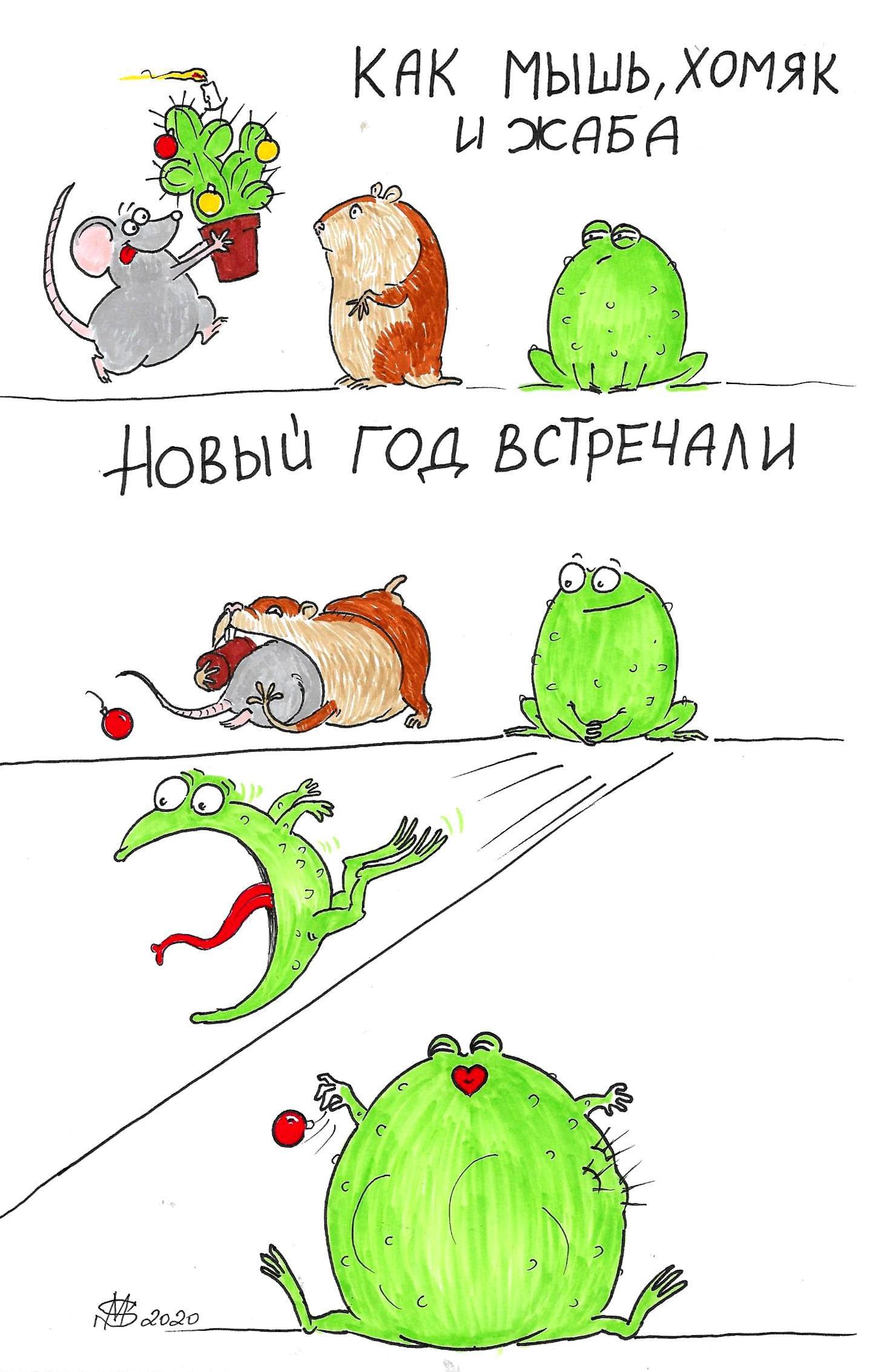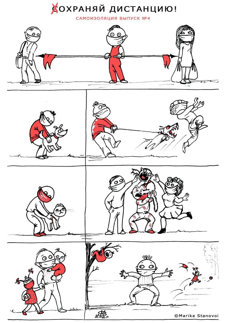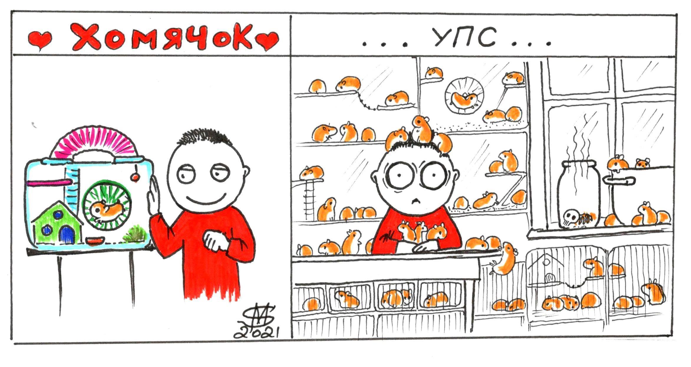 Автор: Marika Stanovoi...Рисованный анекдот в двух-четырех кадрах. Как правило, рисовка более схематическая чем в комиксах, потому что как в анекдоте — тут главное чёткость и краткость формулировки, а не красотень картинки или прорисовка деталюшек.