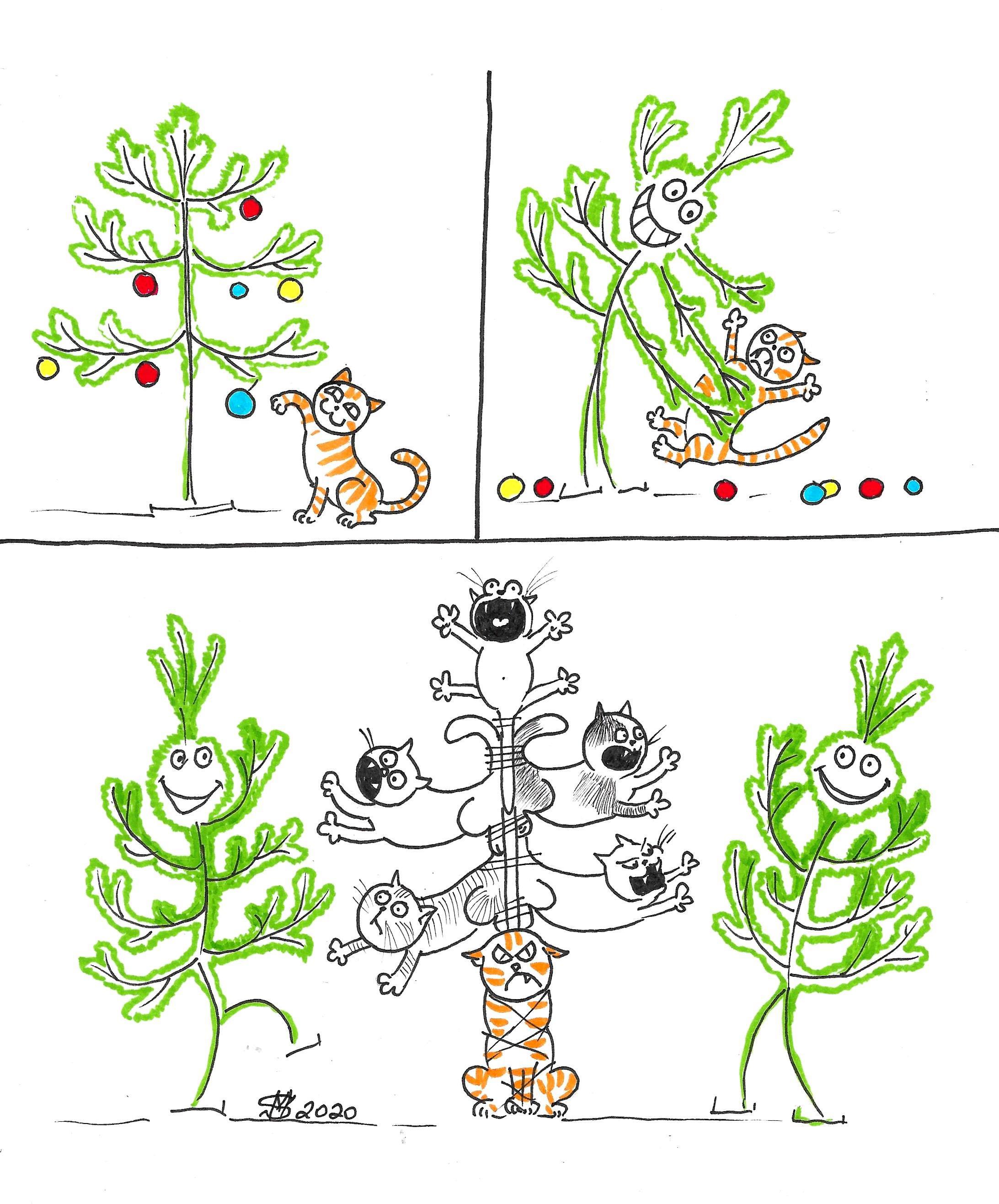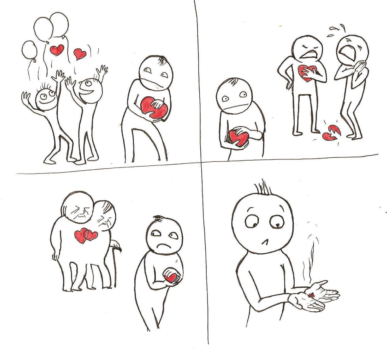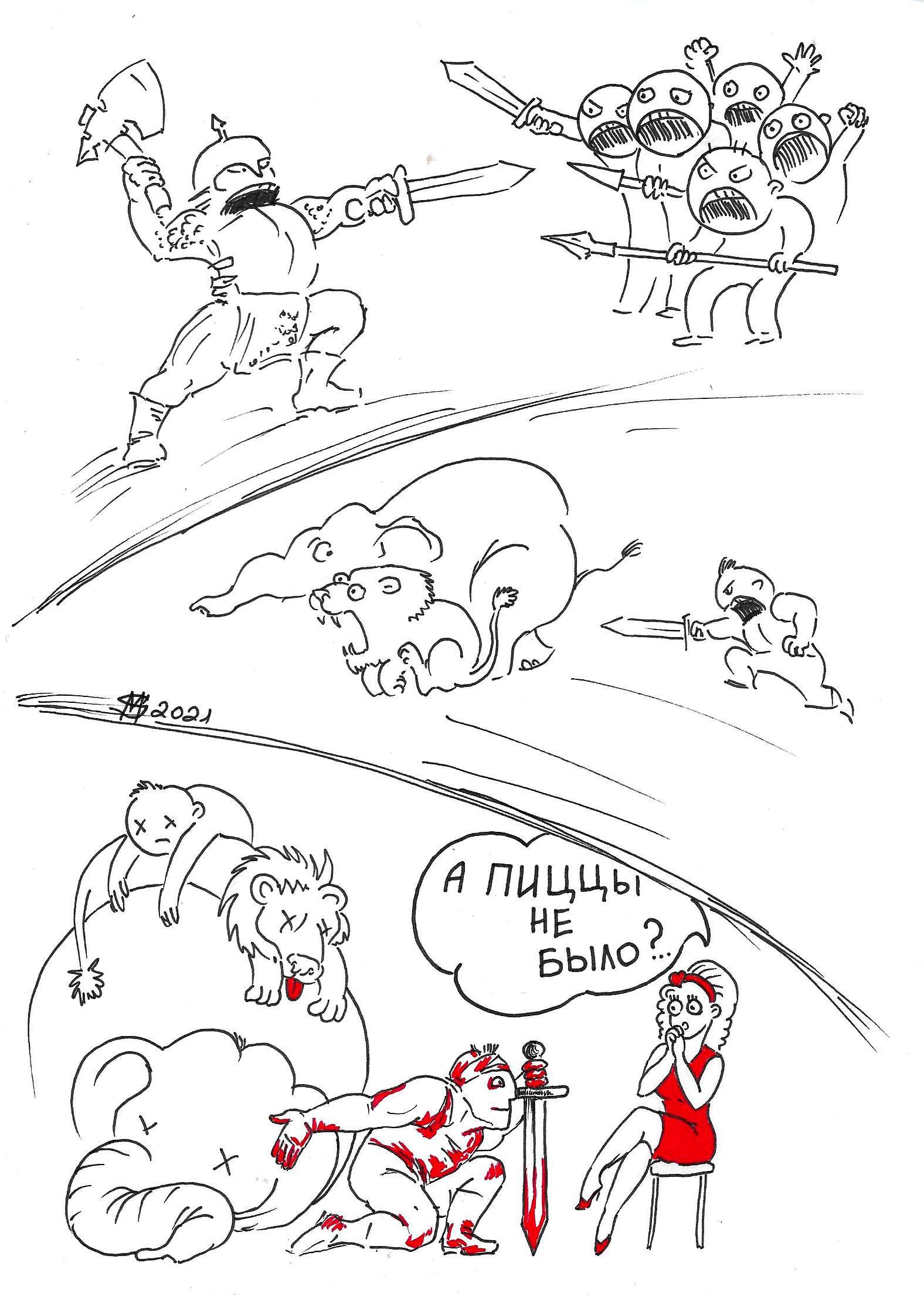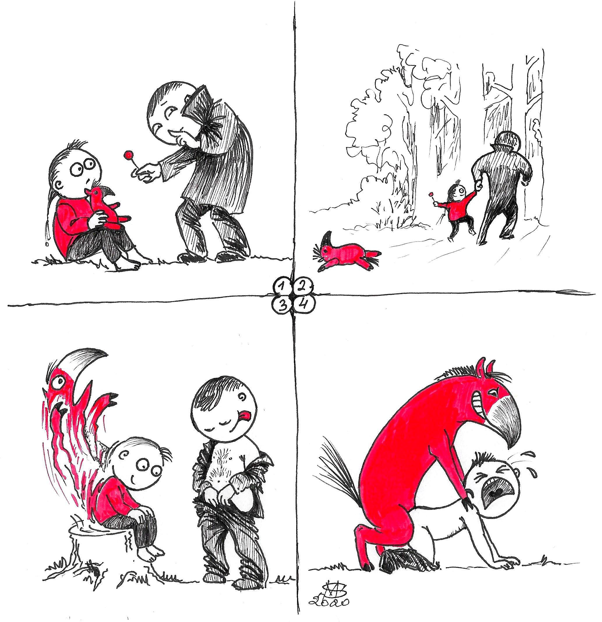 Автор: Marika Stanovoi...Рисованный анекдот в двух-четырех кадрах. Как правило, рисовка более схематическая чем в комиксах, потому что как в анекдоте — тут главное чёткость и краткость формулировки, а не красотень картинки или прорисовка деталюшек.