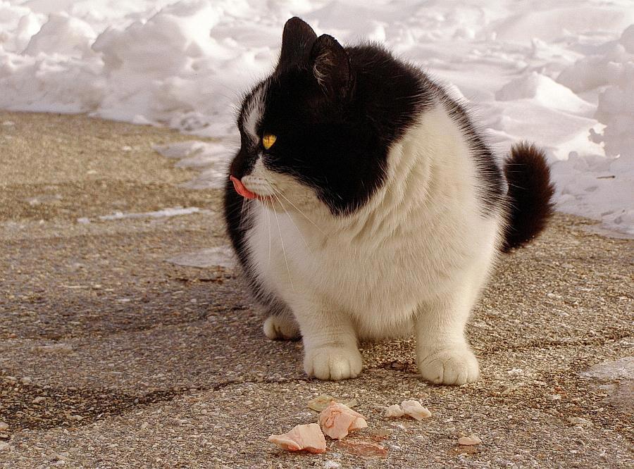 Котица Подвязка, она же - Нашлёпка, которая зимовала рядом с нами на огромной территории санатория Маяк (тоже запад Крыма) прекрасно понимает, что поможет пережить зимние холода. Так что к зиме Нашлёпка становится похожей скорее на панду, чем на изящную кошечку.
