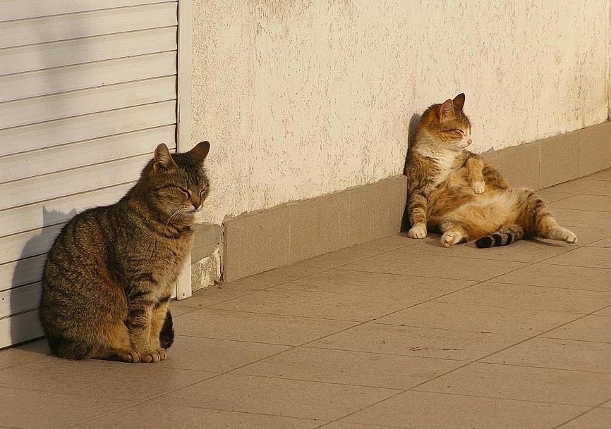 Солнечные ванны после холодной ночи. Это угол моей пятиэтажки, коты из прайда, принадлежного художественным мастерским, так что - богемные коты))) Каждое утро художники и скульпторы, закупив еды на близком городском рынке, собирают прайд для угощения, а потом коты вальяжно рассаживаются у прогретой стены.