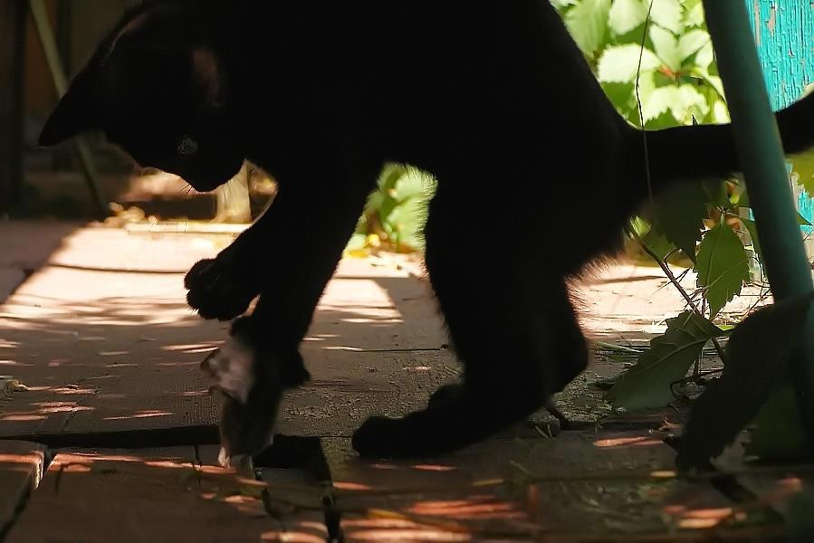 Кошки-мышки. Этот подросток снят летом, на веранде почти заброшенного маленького пансионата в окрестностях Керчи. Мама-кошка изловила мышь и пока мы сидели в тени, котята тренировались. Ну, что с них возьмёшь, хищники. Тем более, росли они в этой заброшенности практически без летних щедрых гостей, только со сторожем и его двумя собаками, так что мы им вовремя подвернулись, хоть и ненадолго.