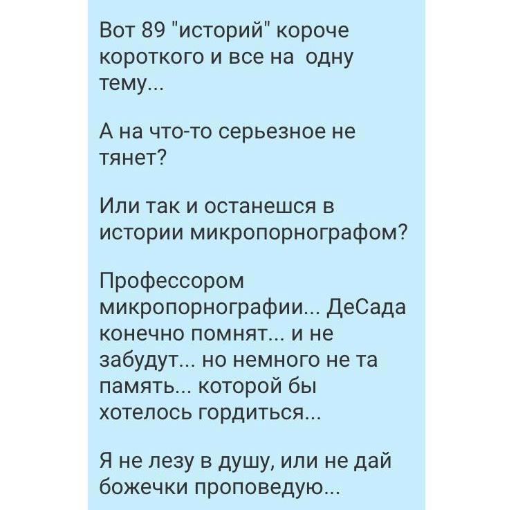 Я бы мог сказать что в начале существования этого аккаунта пытался писать романы (и в итоге все побросал и поудалял, так как пропал интерес).