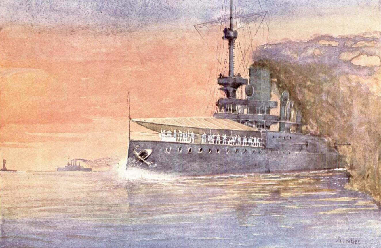 ‘ЛИНКОР ВЕНА’ - ОДНА ИЗ НЕМНОГИХ КАРТИН ГИТЛЕРА, НА КОТОРЫХ ИЗОБРАЖЕНЫ ЛЮДИ. СЛИШКОМ УСТАЛЫЙ ИЛИ ЛЕНИВЫЙ , ЧТОБЫ ЗАКОНЧИТЬ ДЕТАЛИ , ОН СПРЯТАЛ КОРМУ КОРАБЛЯ В ОБЛАКЕ ДЫМА