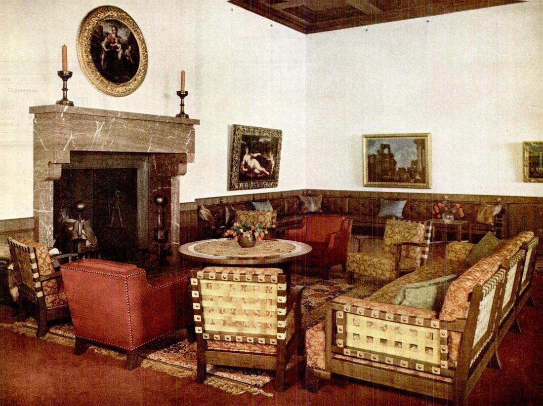 Большой зал Берхтесгадена 74 фута в длину, 18 футов в высоту. На его стенах Гитлер вешает картины по своему личному выбору из немецких музеев. Над каминной полкой - второсортная итальянская мадонна эпохи Возрождения. Как и другим нацистским лидерам, Гитлеру нравятся вид обнаженной натуры и руин.