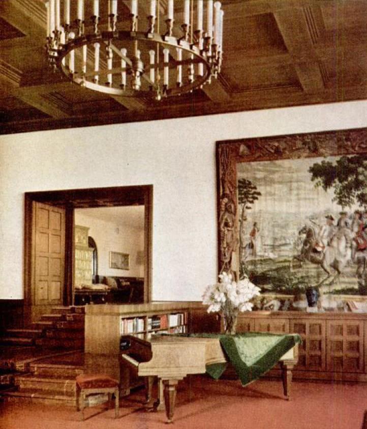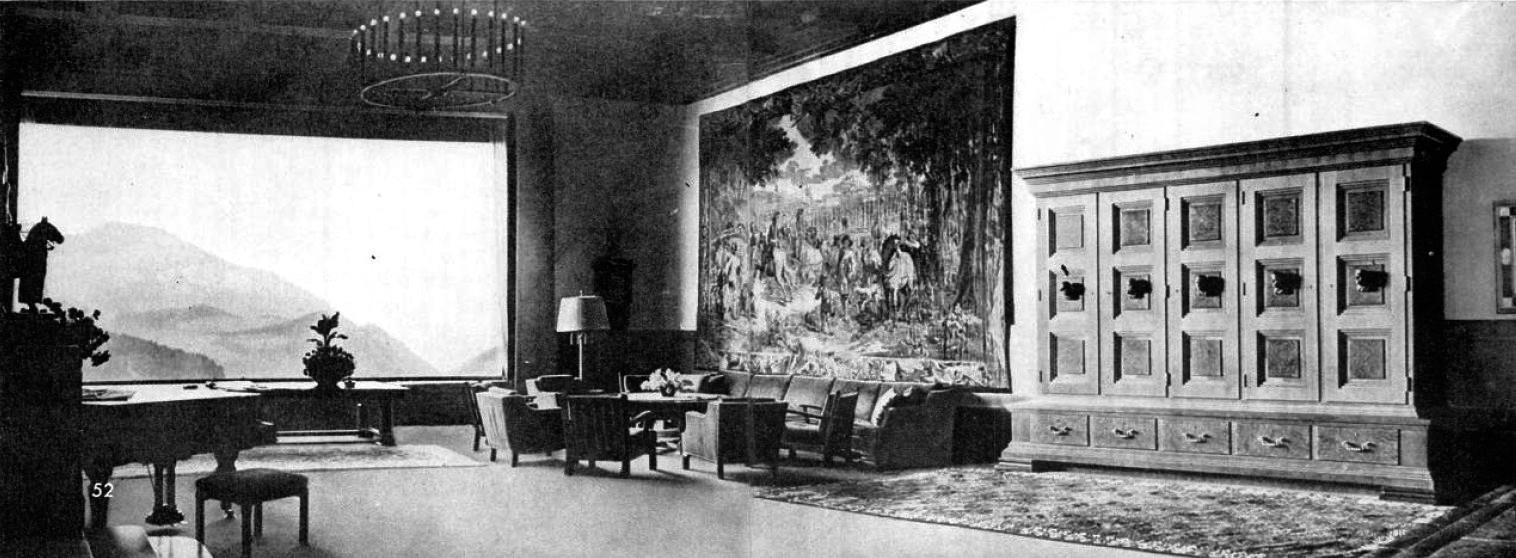 БОЛЬШОЙ ЗАЛ В ДОМЕ ГИТЛЕРА В БЕРХТЕСГАДЕНЕ, КОТОРЫЙ ГИТЛЕР ПОМОГАЛ ПРОЕКТИРОВАТЬ, ВЫХОДИТ ОКНАМИ НА БАВАРСКИЕ АЛЬПЫ. ЗА ГОБЕЛЕНОМ СПРЯТАН КИНОПРОЕКТОР