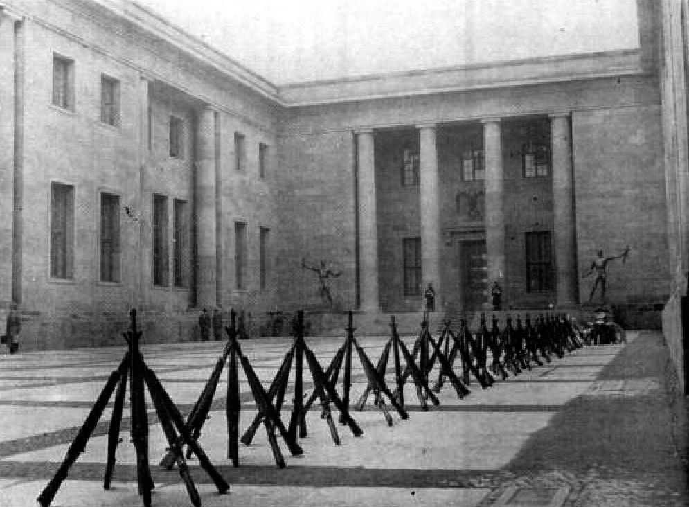 Кабинет Гитлера в Берлине находится в новой рейхсканцелярии. Его архитектурный стиль - это модернизированная классика, которая нравится Гитлеру. Эти винтовки стоят в главном зале.