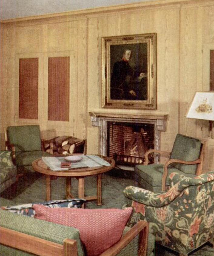 Из Большого зала ступеньки слева ведут в гостиную. На стене висит прекрасный гобелен 17 века, цвета которого повторяются в убранстве комнаты.