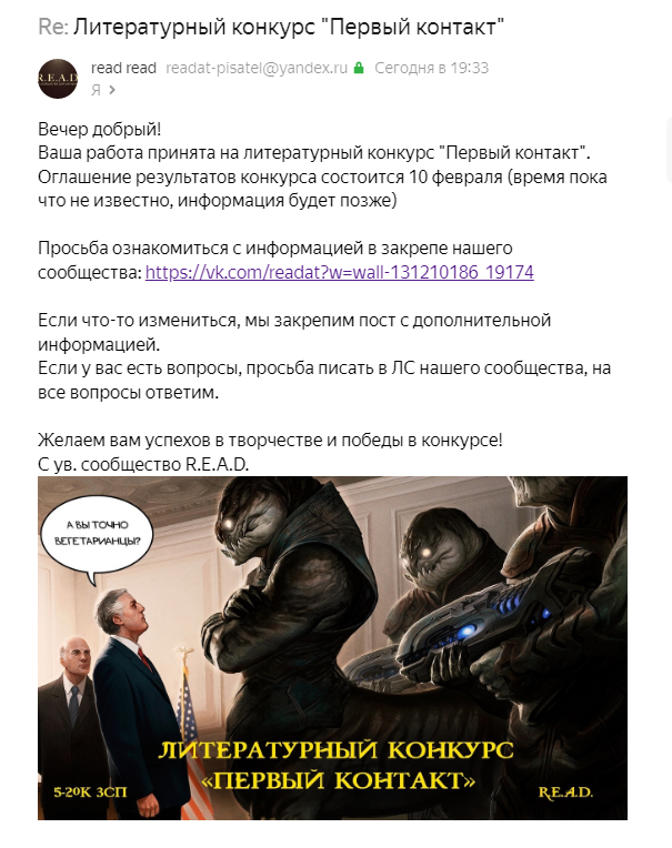 Ну, начну с того, что мою работу таки приняли на конкурс "Первый контакт" от группы в ВК "R.E.A.D.|Книги|Авторы". Я писал раньше, что несколько вышел за верхнюю планку по объему.