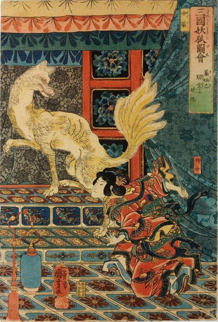 Восьмихвостая лиса на цветной гравюре эпохи Эдо. Художник Утагава Куниёси, XIX в.