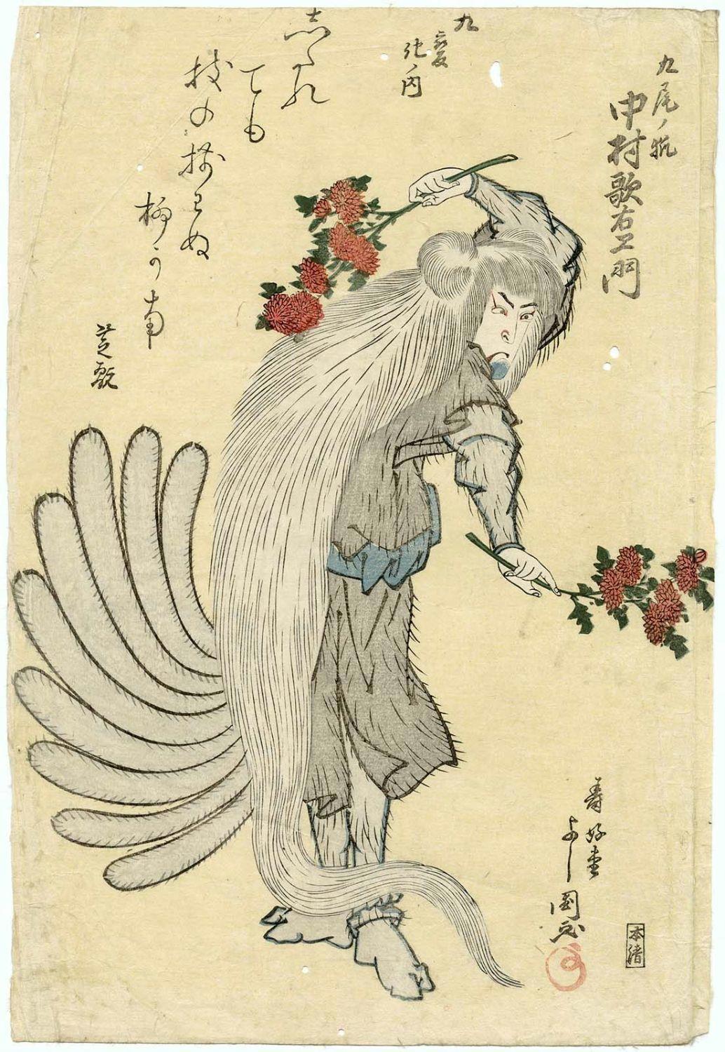 Актёр Накамура Утаэмон III в роли Девятихвостого лиса. «Танец девяти перемен». Художник Тоёкава Ёсикуни, 1825 г.