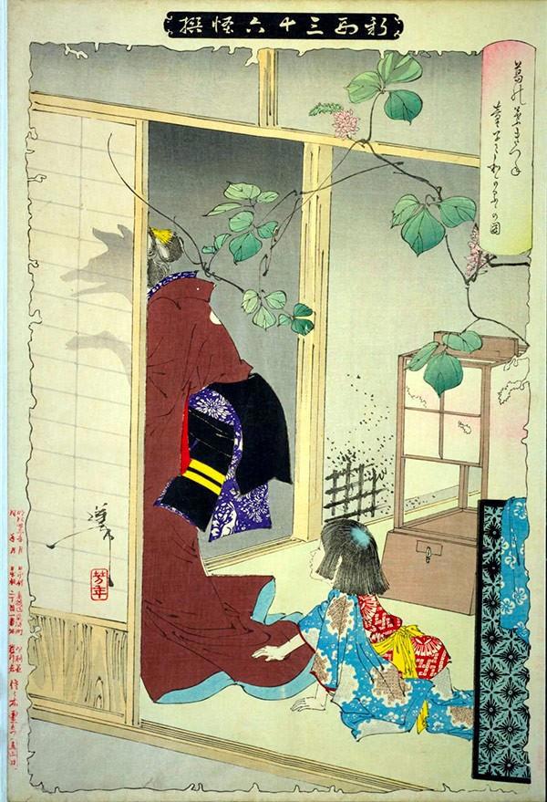 Лиса-оборотень оставляет своего ребёнка. Художник Цукиоко Ёситоси, XIX в.