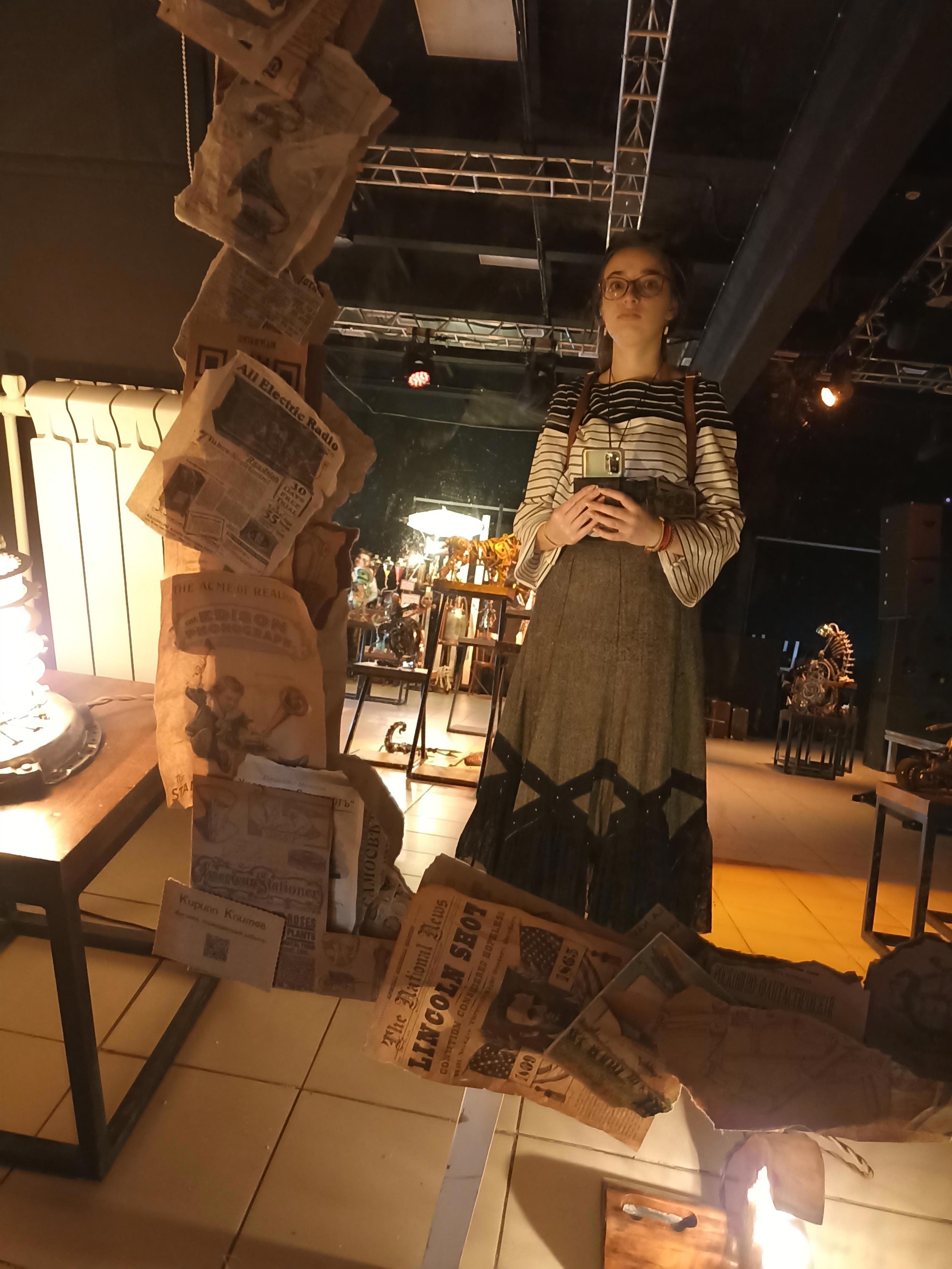 Желтоватые газеты, полумрак, тёплый свет ламп — всё как полагается. Я не образец изящества и красоты, эти понятия вообще идут мимо меня, но хоть какой-то образ подобрать смогла: