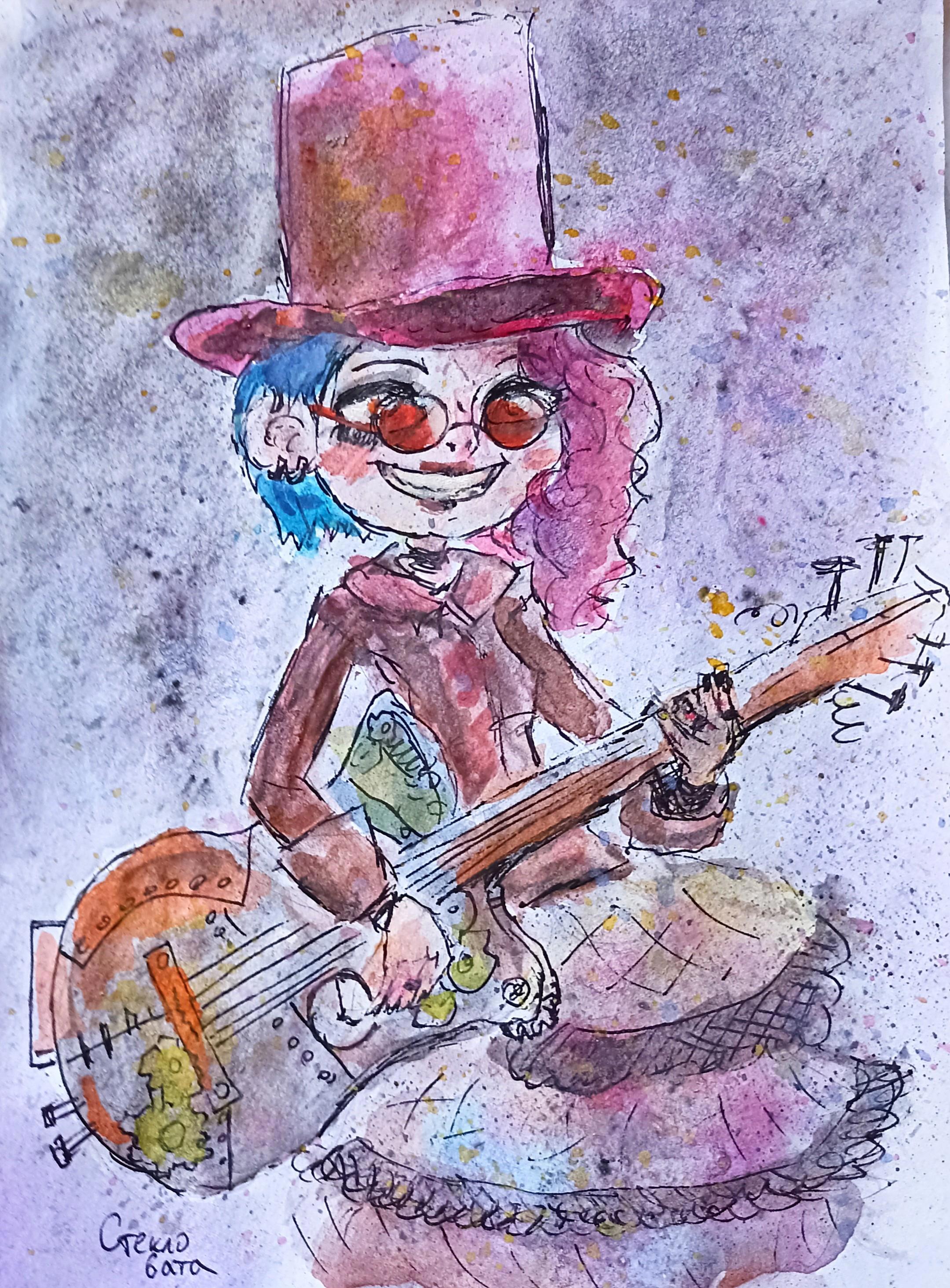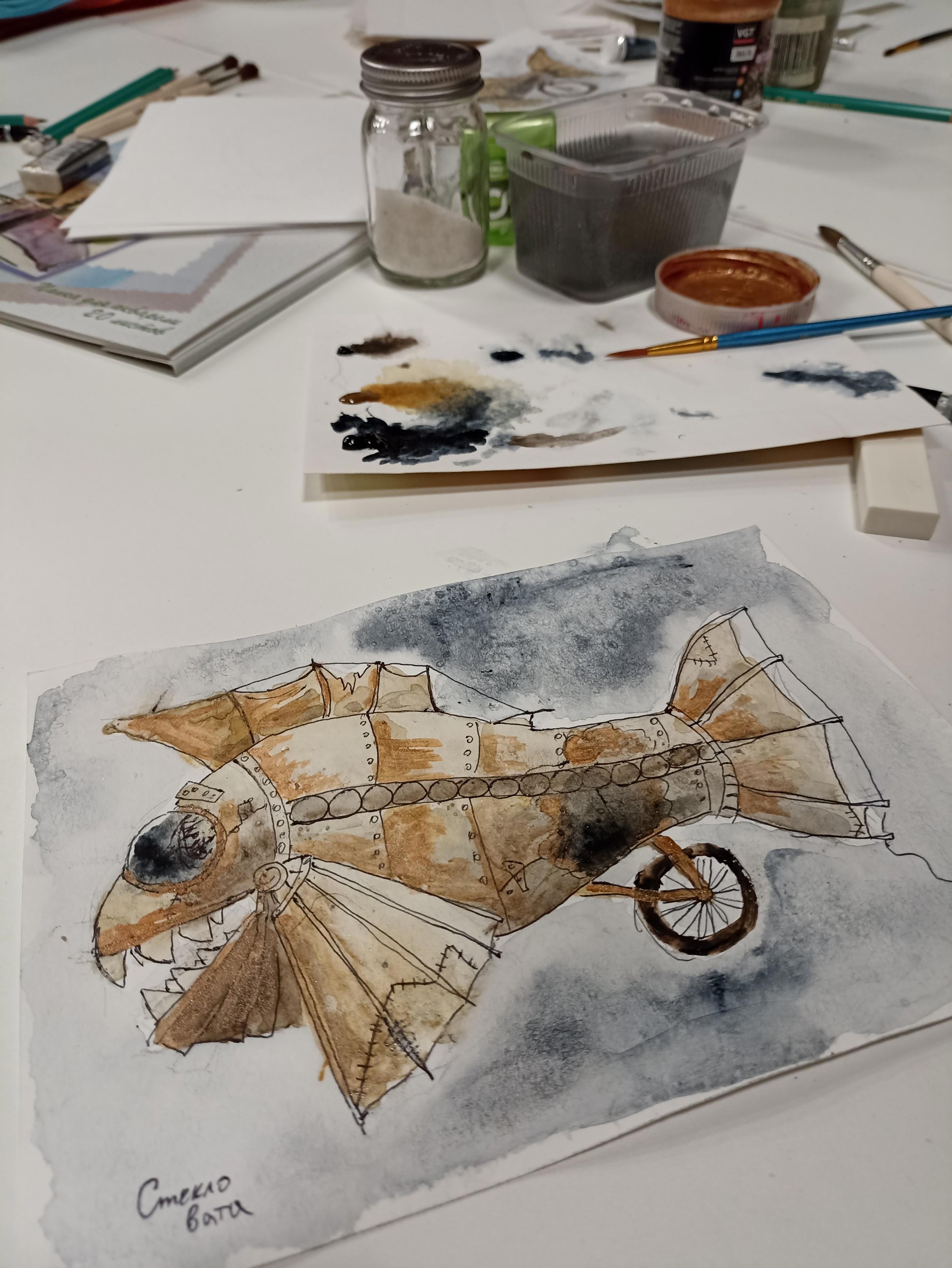 Ещё меня там научили рисовать акварелью стимпанк-рыбу. Эффект ржавчины достигается благодаря соли. Ну ещё краски блестящей медного цвета.