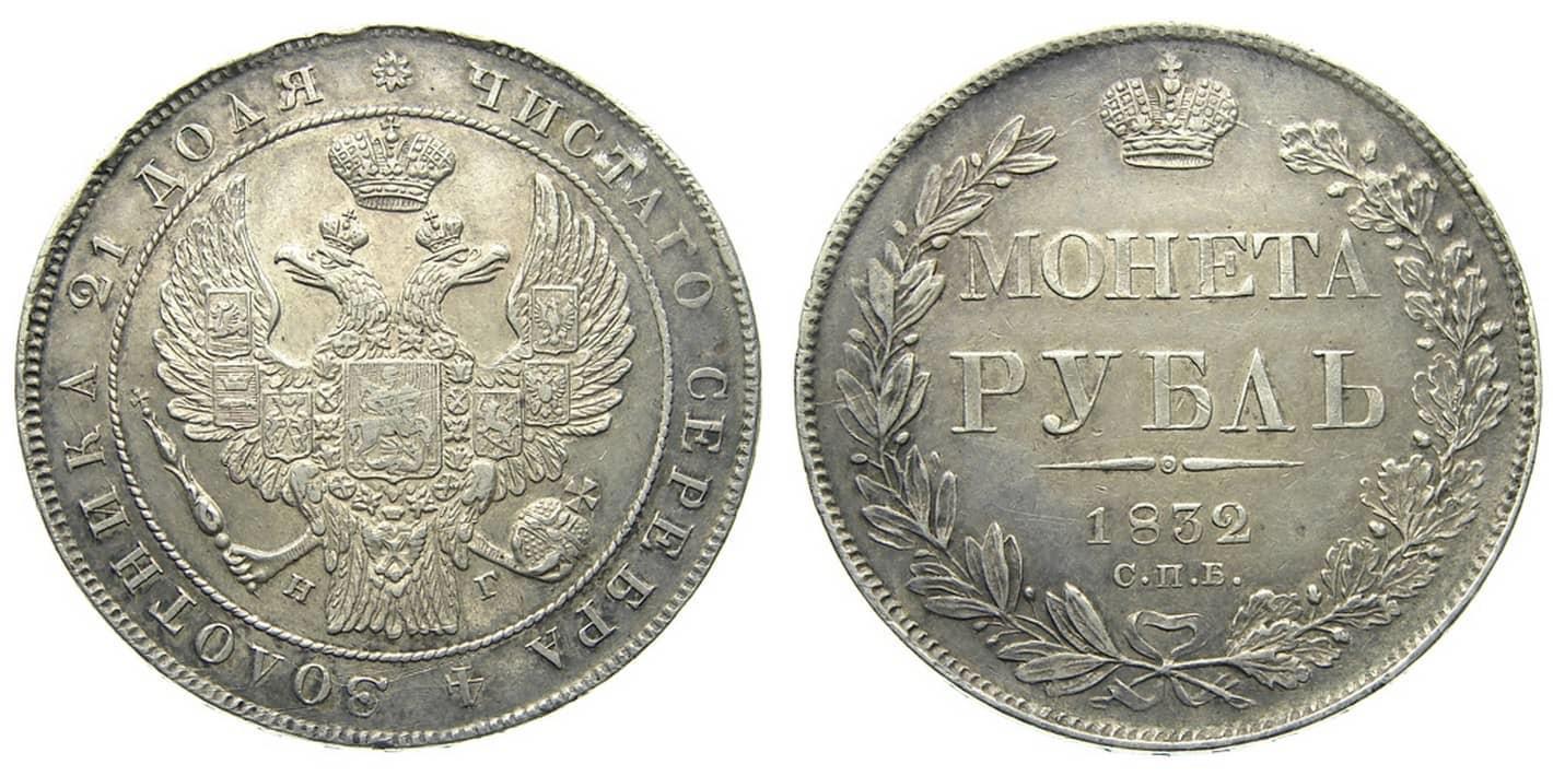 В 1832 году дизайн рубля снова поменялся, "масонский" орел исчез, но портрета на монете по-прежнему не было (фото из интернета):