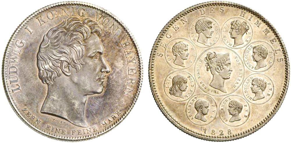 Кстати, дизайн "семейного рубля" скопирован с талера 1828 года "Благословение небес". На одной стороне этой монеты был изображен Король Баварии Людвиг I, а на оборотной - супруга монарха и его дети (фото из интернета):