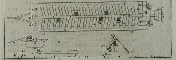 Соответствующий расчет для "Вгасёпе", являющейся галерой конца XVII - начала XVIII в., составляет: расстояние между куршеей и постицей 4,0 м, ширина корпуса 6,4 м, ширина самой куршеи 1,0 м, и, следовательно, расстояние между постицей и корпусом около 7 м расстояния между внешним краем корпуса и внешним краем куршеи. Расстояние между постицей и внешним краем куршеи одновременно было внутренней длиной весла до точки его вращения. На внутреннем конце весла были установлены захваты для рук, так как само весло было слишком толстым, чтобы руки гребцов могли непосредственно его удерживать. Отметим, что количество захватов было на одно меньше, чем гребцов на весло, так как внутренний гребец прямо держал суженный нок весла.
