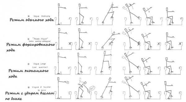 Большая французская Кёа1е конца XVII - начала XVIII в. при длине 57 м, ширине 6,4 м и осадке 2,2 м с 33 парами весел и семью гребцами на весло на коротких участках при 25 гребках в минуту могла развивать и в течении 20 минут поддерживать скорость до 185 м (1 кабельтов) в минуту, что соответствует 6 узлам (я в этом сомневаюсь, объяснение ниже в описании весел.).