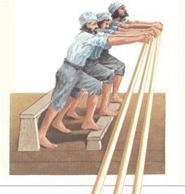 Весельное устройство как главное средство движения галер и галеасов не только занимало большое место на этих судах, но оно также определяло их общий вид. Для гребных судов действуют два основных правила: первое, уже упоминавшееся, - корпус судна, по возможности, должен быть длинным и узким, и второе - чтобы весла были как можно длиннее, чтобы они могли захватывать воду подальше от судна. Поэтому для работы с ними точку вращения весла следует вынести тоже наружу, чтобы выгоднее использовать принцип рычага.
