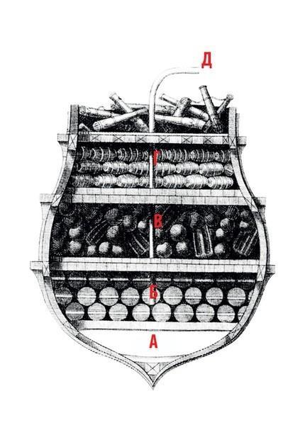 Разрез типового брандера XVII века. А. Песок для утяжеления днища. Б. Палуба с пороховыми бомбами и футеровкой на бортах, чтобы корабль не разрушился прежде времени. В. Палуба, заполненная бомбами и «шрапнелью» — старыми лодками и деревянными деталями для поражения живой силы противника. Г. Палуба с зажигательными материалами. Д. Канал (труба) для вывода огня и продуктов горения.