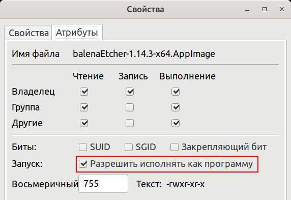 Способ третий. Есть такой формат файлов .appimage. По сути принцип работы у него тот же, что и у хорошо знакомых нам .exe, т.е. можно напрямую запускать двойным кликом по файлу. С той оговоркой, что перед этим ему нужно дать право стать исполняемым файлом, тыкнув галочку в настройках.