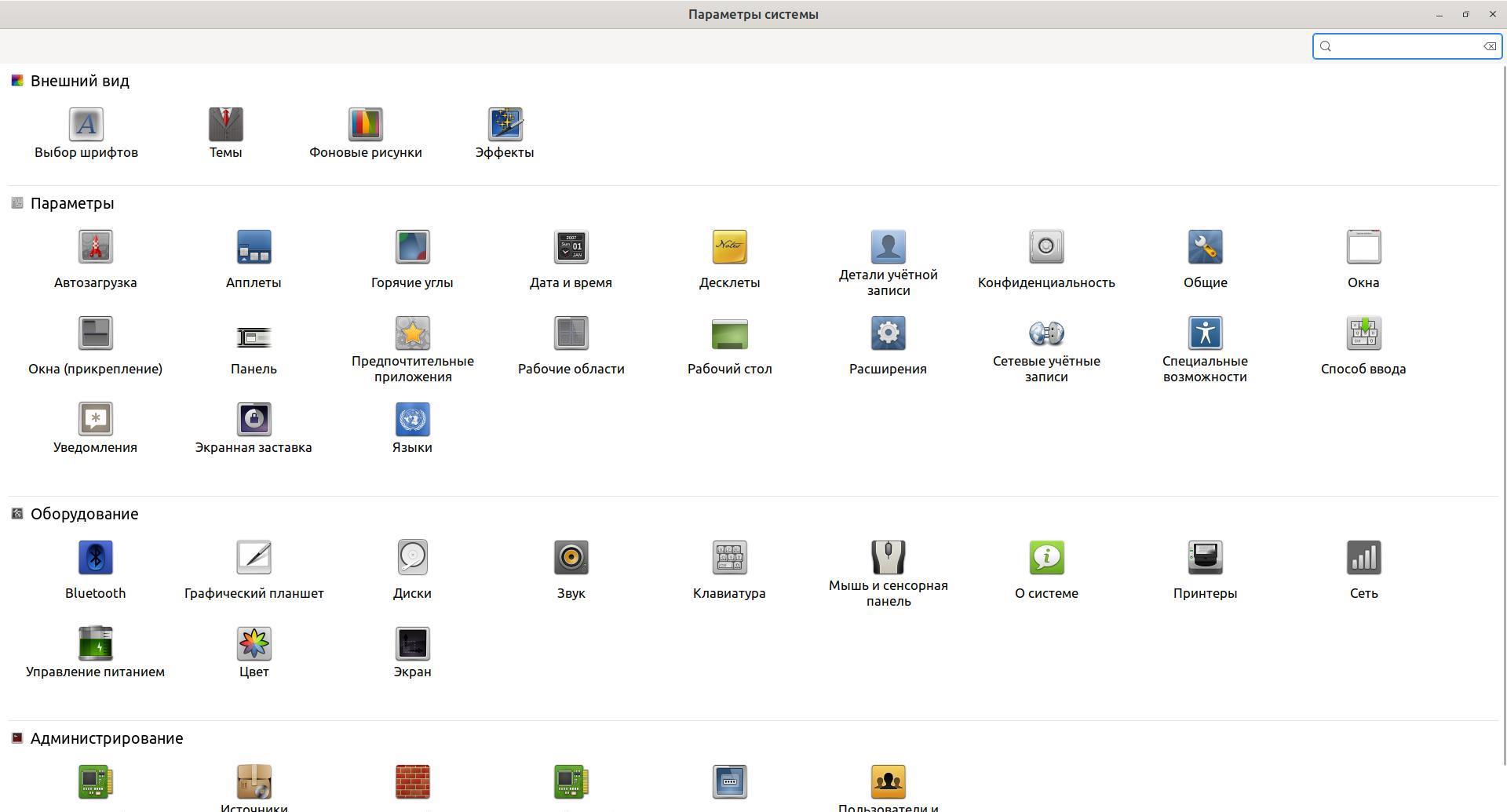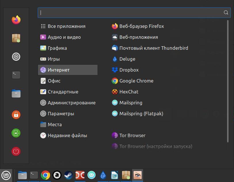 Как видим, всё просто, удобно и понятно. Слева важные кнопочки вроде выключения, терминала, настроек и пакетного менеджера, справа список программ, разбитых по категориям, сверху строка поиска. Довольно умная строка, замечу, понимающая даже виндовые команды. К примеру, текстовый редактор можно вызвать командой «notepad», а терминал — командой «cmd».