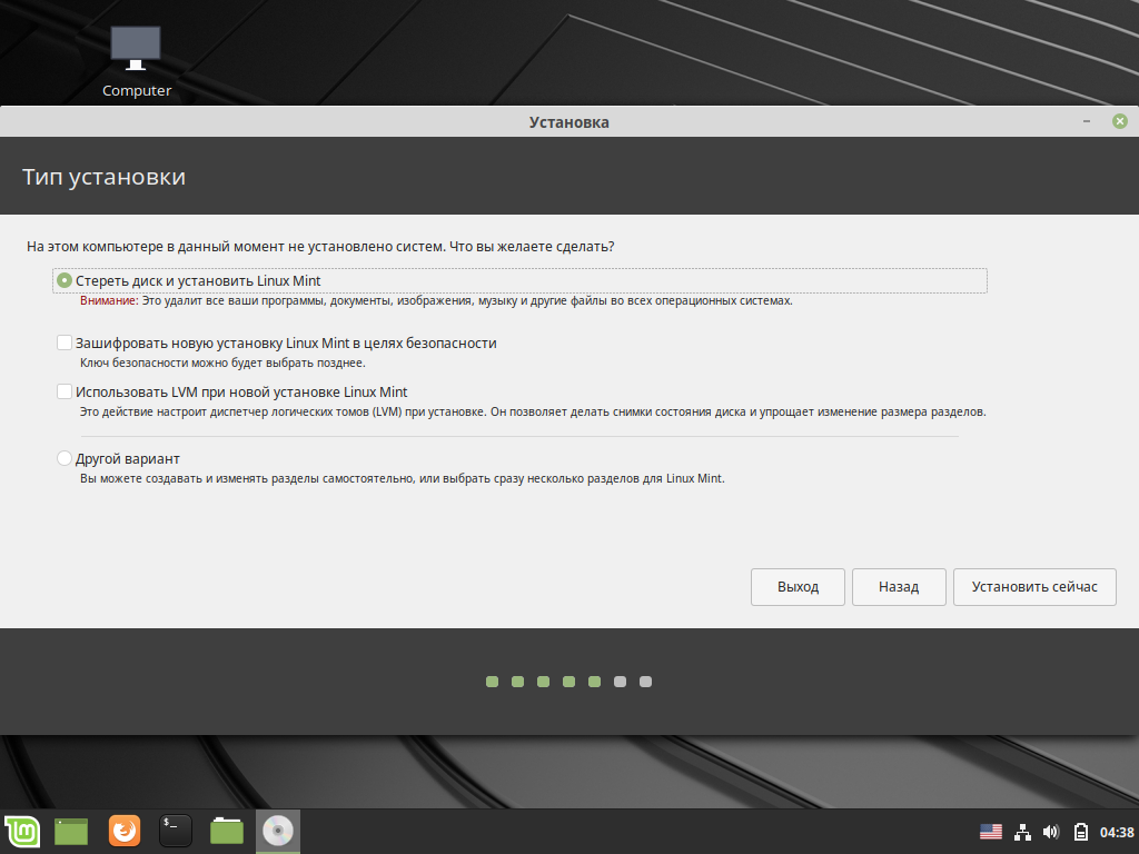 Убедившись, что с LiveUSB всё запускается без нареканий, приступил к установке, запускаемой там же с рабочего стола.