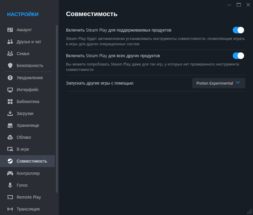 Кроме этого, нужна софтина Proton, отвечающая за запуск виндовых игр на линуксе. В стиме она идёт в комплекте, нужно лишь отметить галочку в настройках, и всё необходимое подгрузится само.