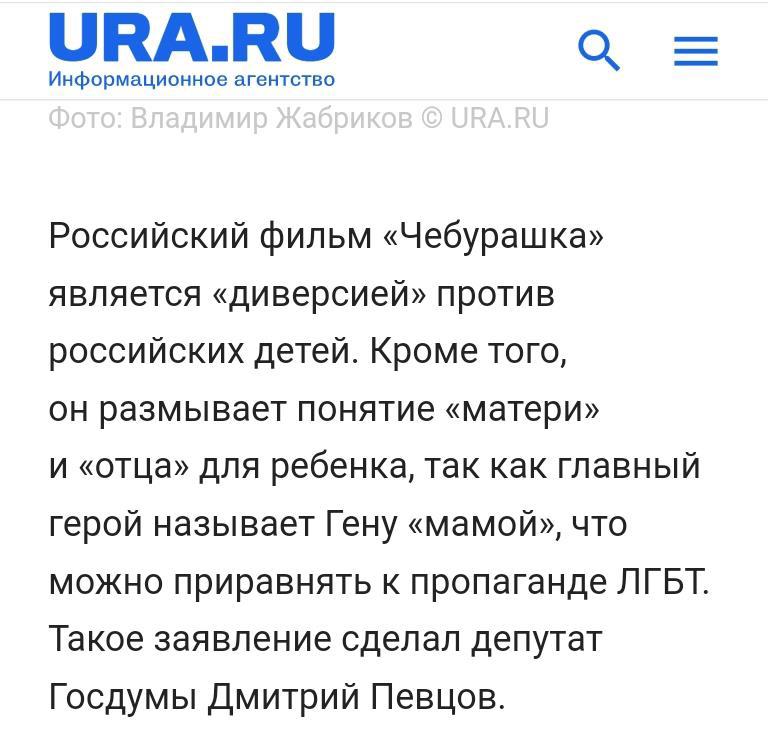 Семейная комедия "Чебурашка" бьёт рекорды популярности. Совпадение? Не думаю! Как и роман "Лето в пионерском галстуке", кино изобилует психологическими зацепками, которые должны завлечь в сети девственные умы. Лучшие педагожки и неврологини в звании полковников ЦРУ трудились над тем, чтобы создать вкусную гомоприманку. И внедрённая в сюжет диавольская гомоересь падает на головы наших людей, точно граната с нацистского дрона. Пушистый ушастик называет дядю Гену - мужчину - "мамой". Так исподволь, словно змея, ползущая в дом, внедряется в юные умы сатанинский нарратив о гендерной вариативности.