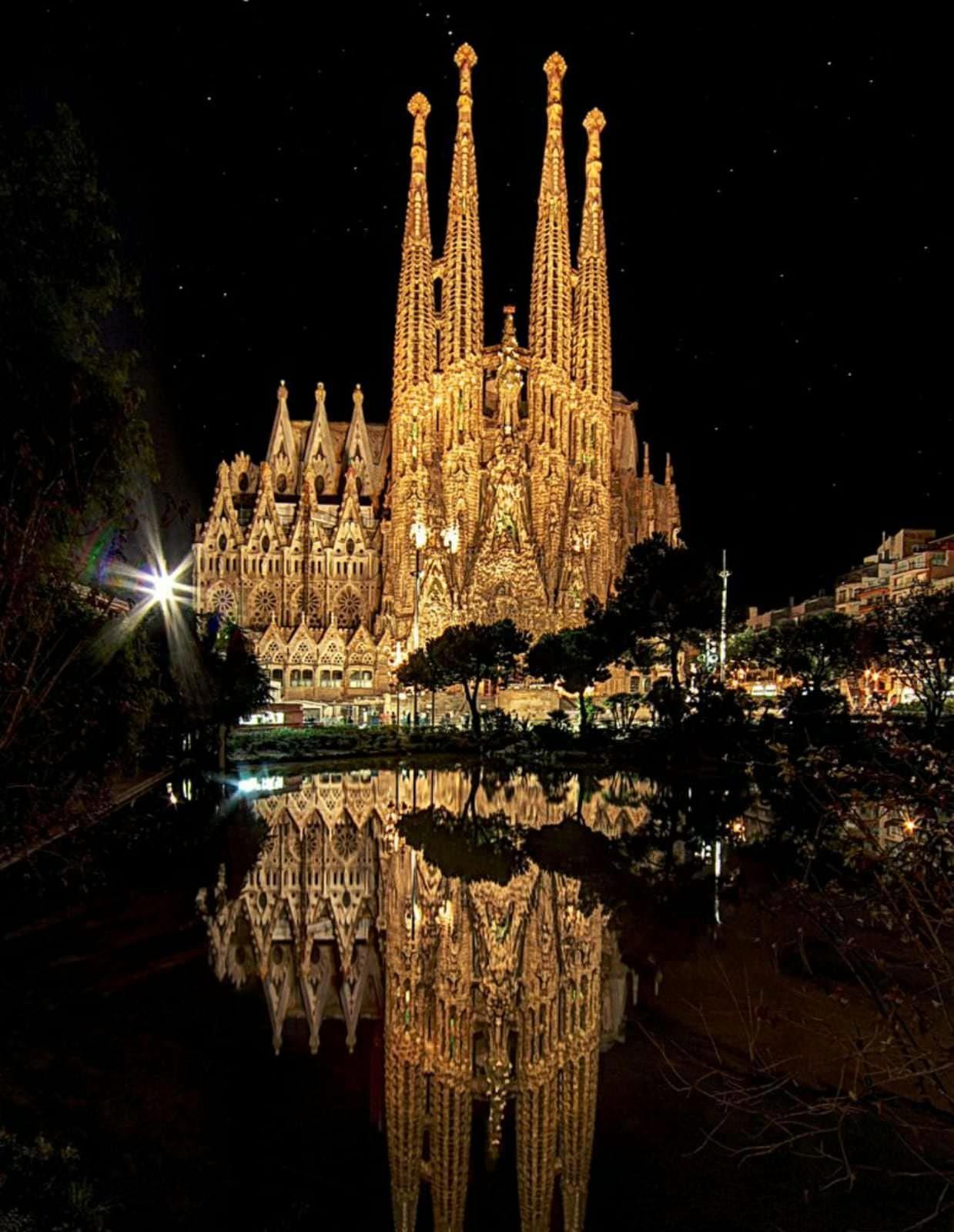 Вид на храм Святого Семейства (архитектор А. Гауди) ночью.