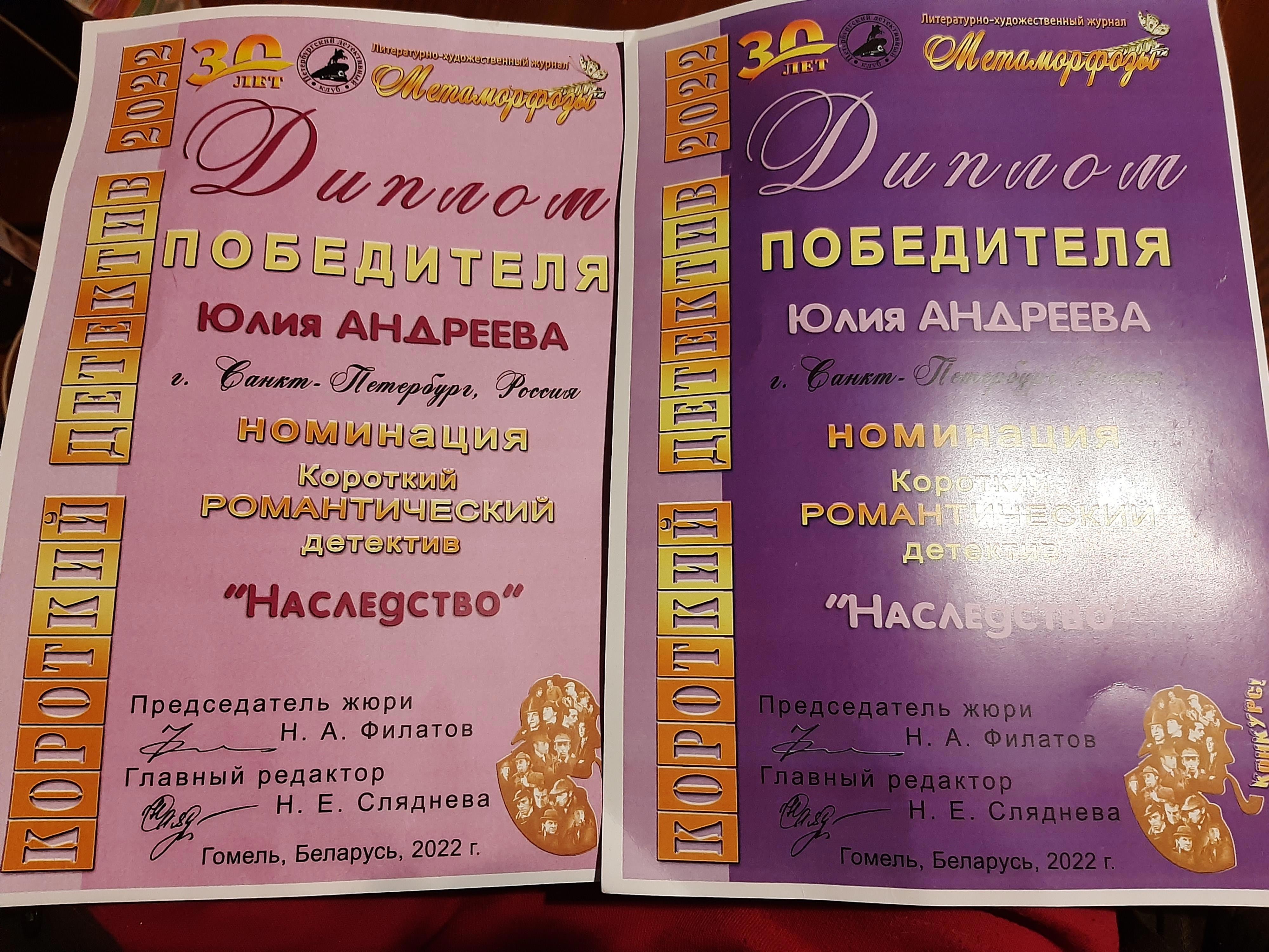 Вчера в Доме писателей наконец-то получила свой диплом победителя конкурса "Короткий детектив" журнала Метаморфозы (Беларусь) в номинации "Романтический детектив" за рассказ "Наследство" и авторские экземпляры журнала в котором он вышел.