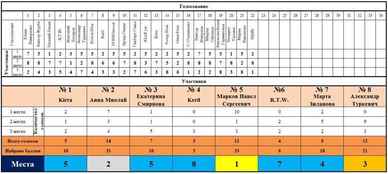 Как сообщалось ранее, первоначально наметились три явных претендента на призовые места. Однако последний день голосования преподнес сюрприз: разгорелась упорная борьба за третье место. Претенденту удалось на один балл опередить своего предшественника. Также большое спасибо участнику игры-марафона Алексею Дмитриеву за таблицу с результатами голосования.