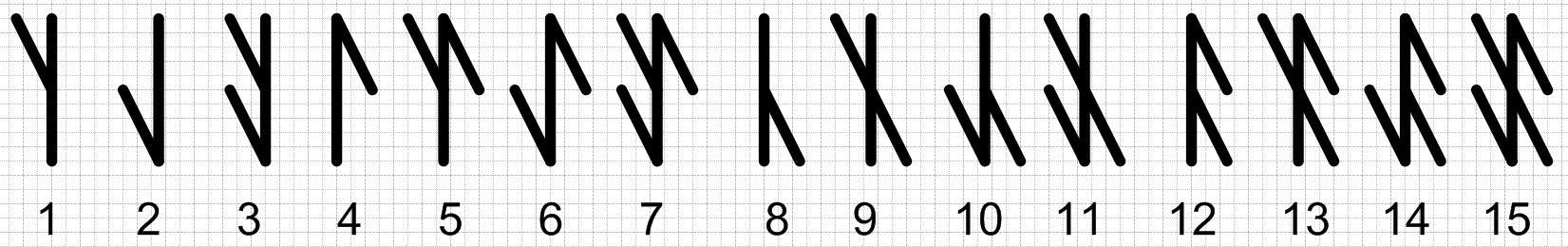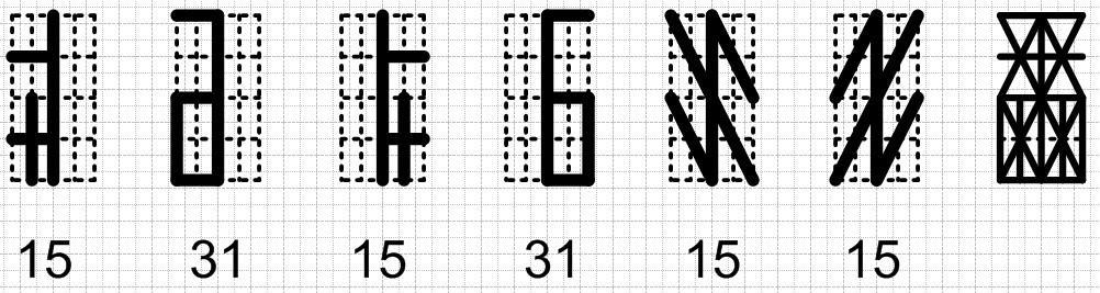 На этом рисунке изображен пятый разряд моих символов в сочетании с базисом и их десятичными значениями ниже, шестой разряд аналогично, но наклон элементов вправо.